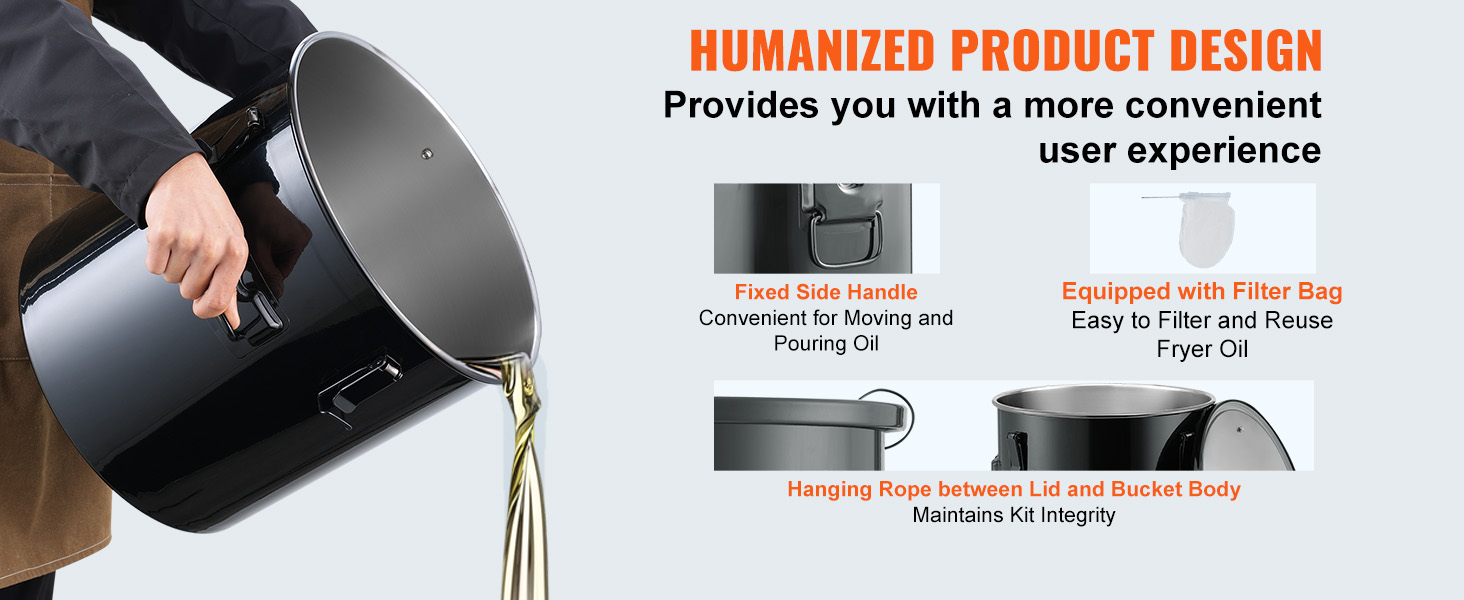Už vás nebaví neustále vyprázdňovať odpadkový kôš? Naše vedro na tuk z fritézy vám kryje chrbát svojou obrovskou kapacitou. Je ideálne pre kuchyne, pretože vďaka nemu je filtrovanie, skladovanie a premiestňovanie oleja hračka!