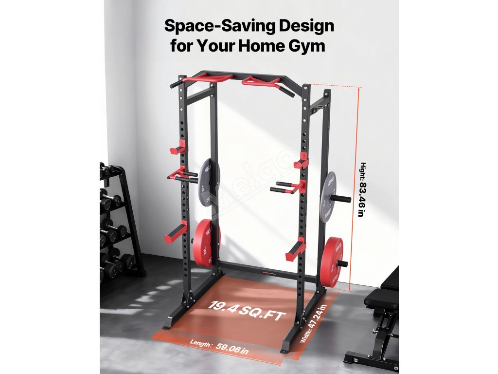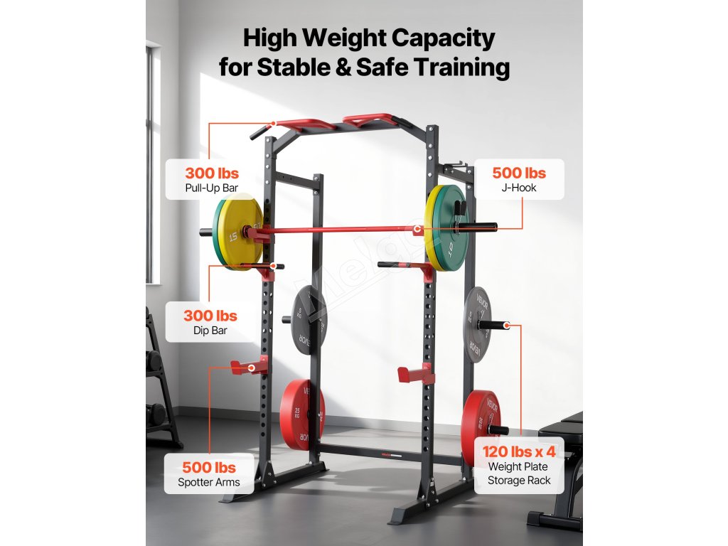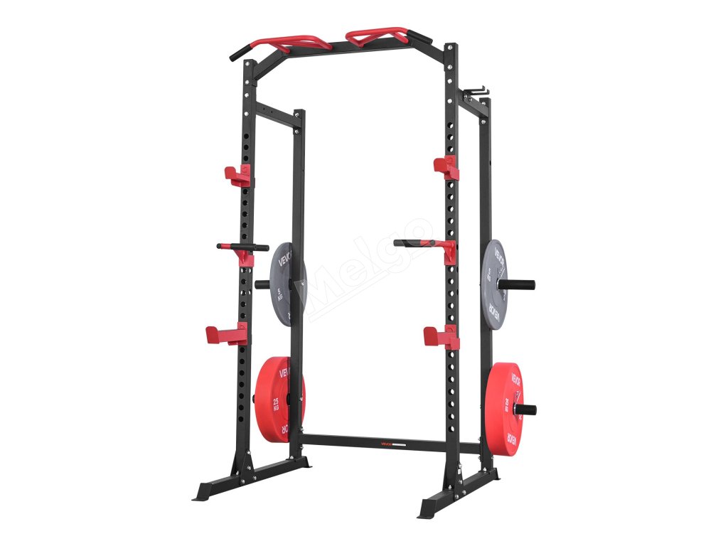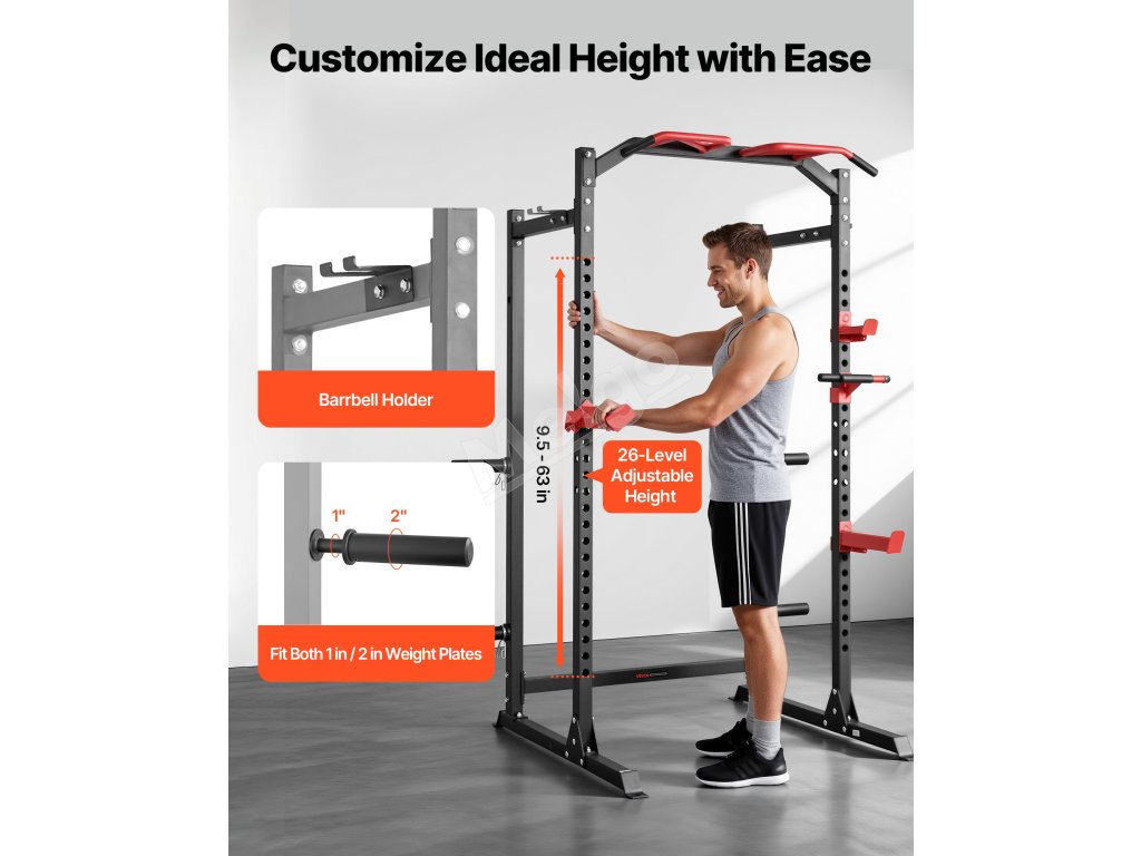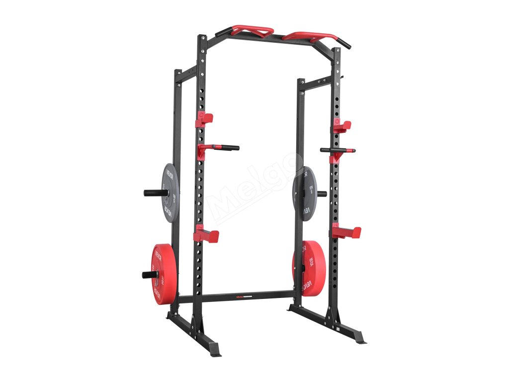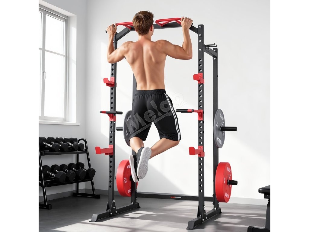Posilňovací power rack s nastaviteľnou výškou, j-háky, hrazda, dipy