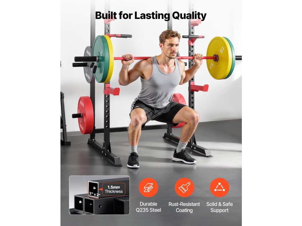 Tento posilňovací stojan je vyrobený z hlavného oceľového rámu s rozmermi 2" x 2" a zosilnených rúrok s hrúbkou 1,5 mm, vďaka čomu poskytuje pevnú oporu a znižuje kolísanie, čím zabezpečuje bezpečnejší a spoľahlivejší silový tréning.