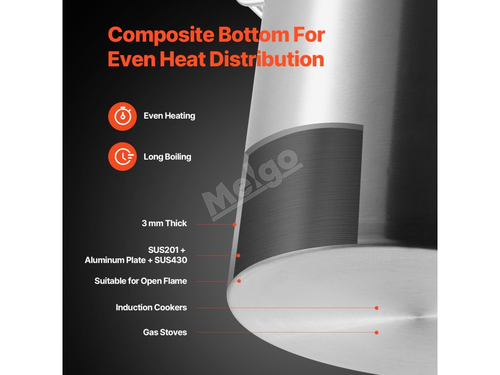 Hrniec na vývar, ktorý je celý vyrobený z vysokokvalitného materiálu z nehrdzavejúcej ocele, ponúka vynikajúcu tepelnú odolnosť a odolnosť proti korózii, čo zaručuje dlhú životnosť pri dusení pri vysokej teplote a varení kyslých surovín!