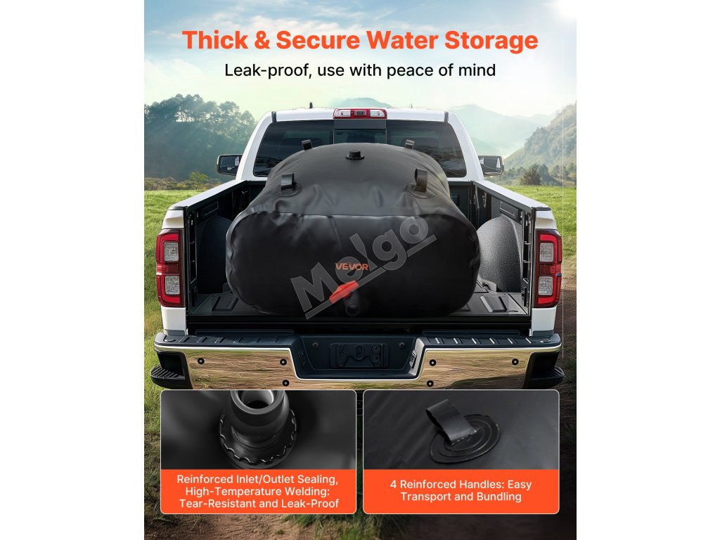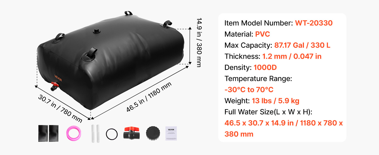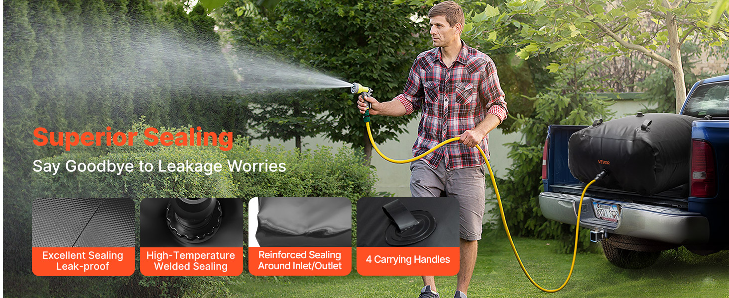 Tento skladací vak na vodu VEVOR s objemom 87,17 galónov/330 l je vyrobený z odolného dvojvrstvového PVC materiálu 1000D, ktorý poskytuje vynikajúcu odolnosť. Jeho pevná tesniaca a nepriepustná konštrukcia zaručuje spoľahlivé uskladnenie vody na vonkajšie dobrodružstvá, domáce použitie, záhradkárčenie alebo v núdzových situáciách