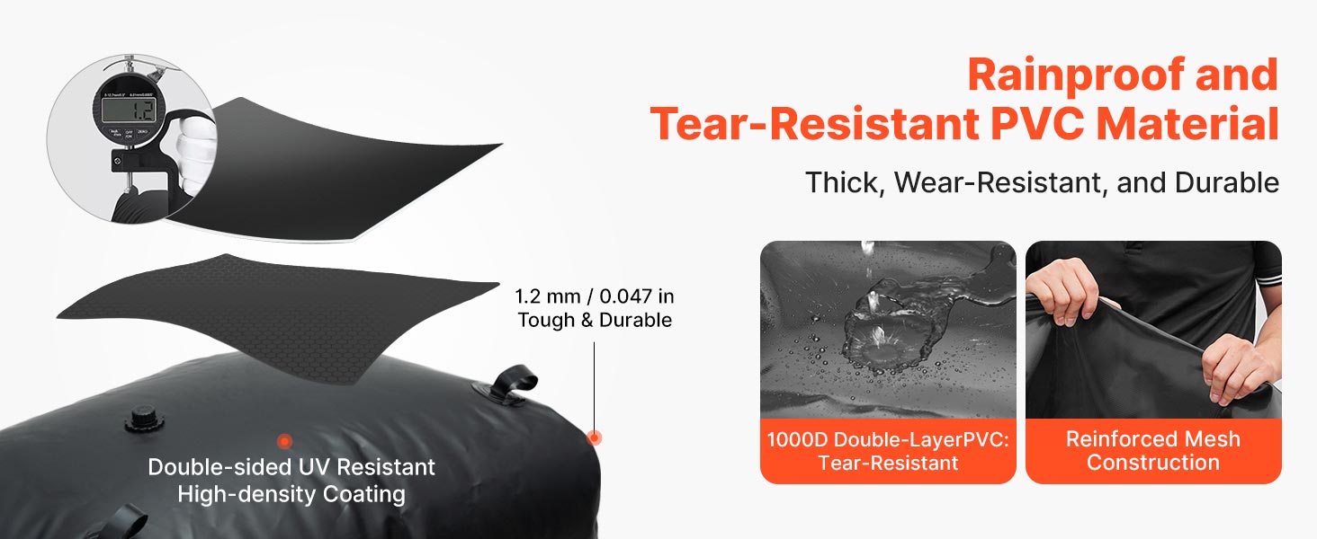 Táto nádrž na vodu vyrobená z odolného dvojvrstvového PVC 1000D je odolná proti dažďu, ohňu, opotrebovaniu a ľahko sa formuje, takže je ideálna na každodenné domáce použitie, outdoorové aktivity, kempovanie a zavlažovanie v poľnohospodárstve.