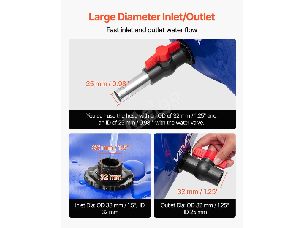 Naša skladacia nádoba na vodu je vybavená vstupmi a výstupmi s veľkým priemerom, ktoré zabezpečujú plynulý prietok vody a ľahkú kompatibilitu s rôznymi hadicami a vysokotlakovými čističmi. Ideálna na domáce použitie, kempovanie a iné outdoorové aktivity.