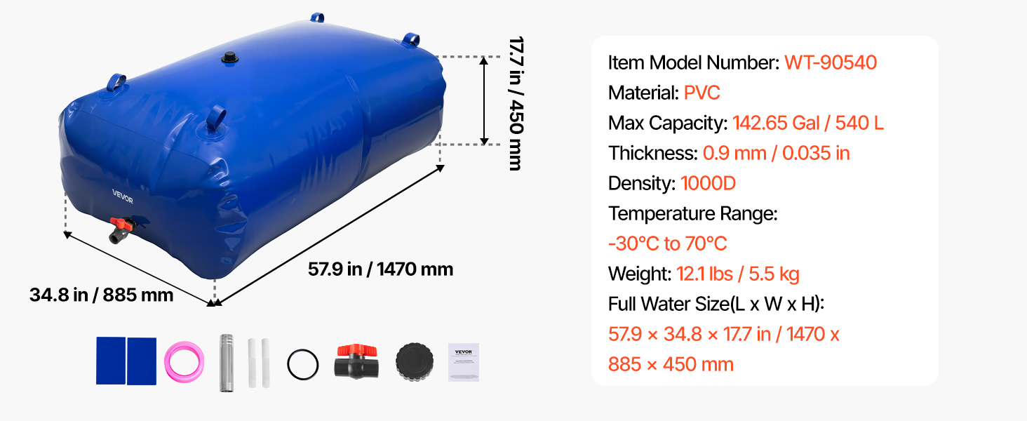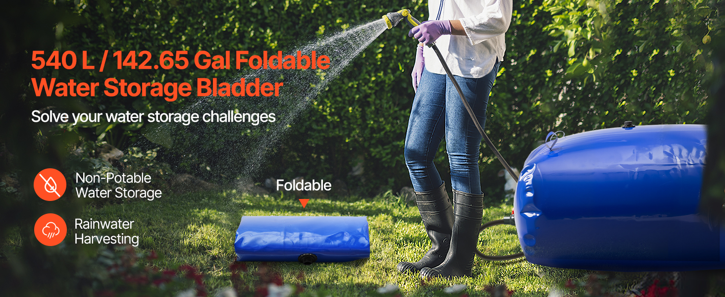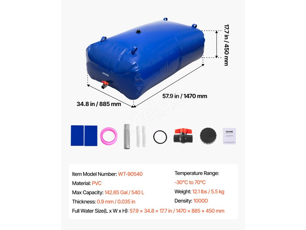 Táto skladacia nádrž na vodu s kapacitou 142,65 galónov je vyrobená z odolného dvojvrstvového PVC 1000D. Jeho silné tesnenie a nepriepustná konštrukcia zabezpečujú bezpečné a efektívne používanie vody. Vhodná na vonkajšie aktivity, domáce použitie, zavlažovanie záhrady a núdzové zásobovanie vodou.