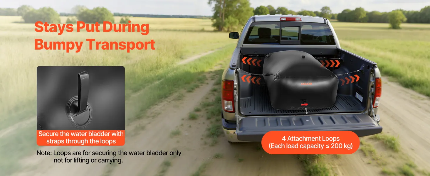 Udržiavajte vodný mechúr stabilný v lôžku pickupu, kufri SUV alebo na streche, čím sa zabráni jeho posúvaniu alebo kotúľaniu počas nerovnej jazdy a udrží sa stabilné ťažisko.