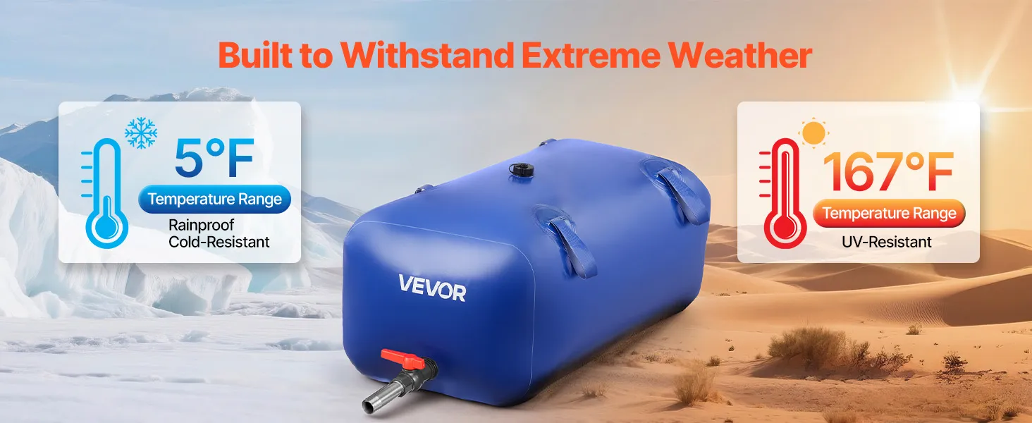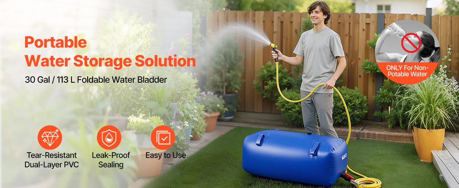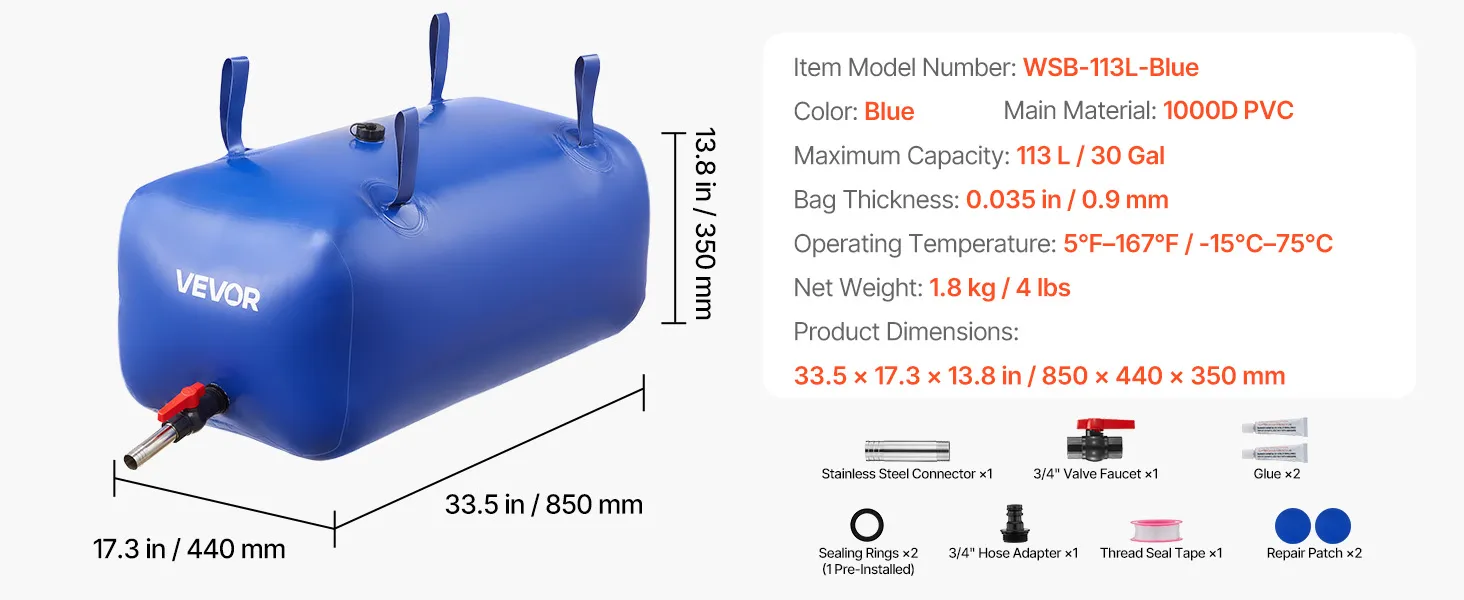 Tento skladací vak na vodu s objemom 30 galónov je viacúčelovým riešením na skladovanie vody, ktoré zabezpečuje spoľahlivé zásobovanie vodou v exteriéri.