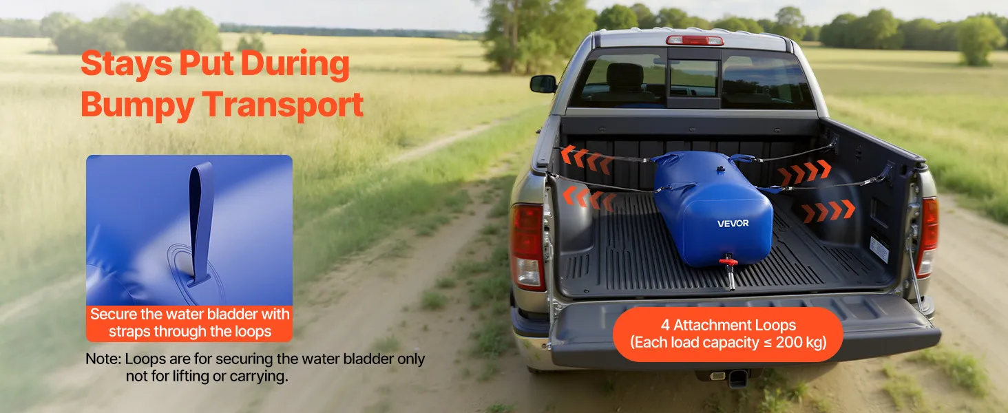 Udržiavajte vodný mechúr stabilný v lôžku pickupu, kufri SUV alebo na streche, čím sa zabráni jeho posúvaniu alebo kotúľaniu počas nerovnej jazdy a udrží sa stabilné ťažisko.