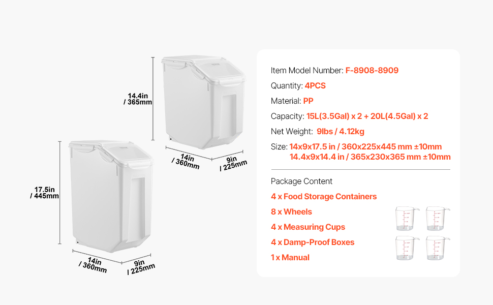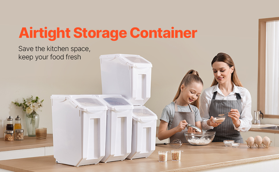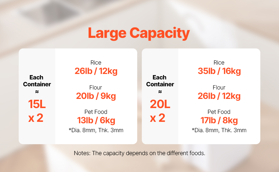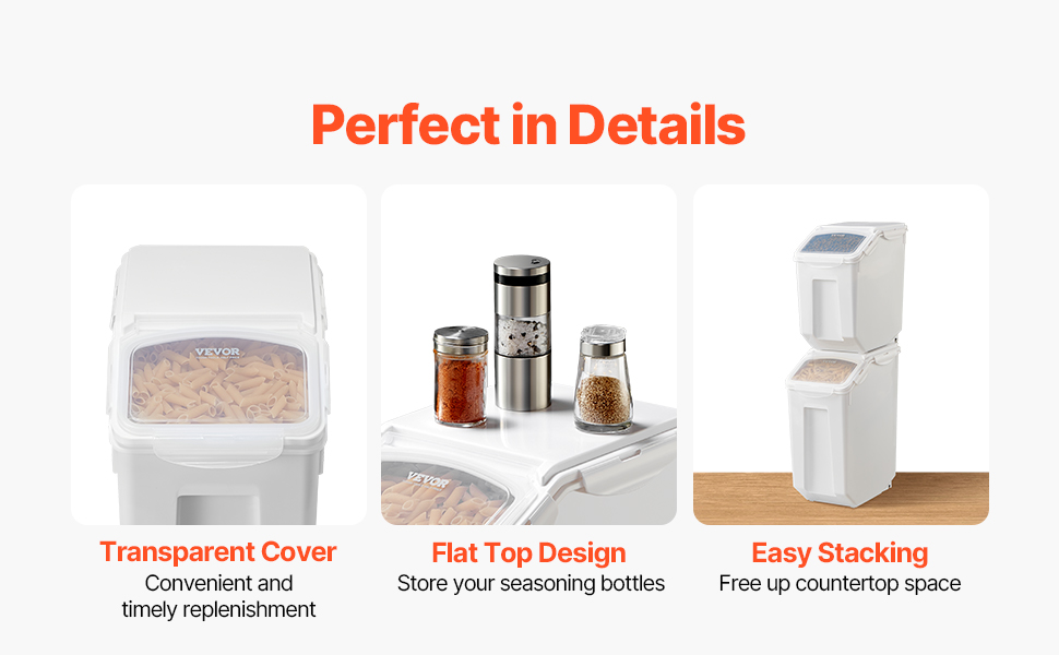 V závislosti od typu a hmotnosti vášho suchého tovaru sa do 15 l nádoby zmestí až 26 kg ryže alebo 13 kg krmiva pre domáce zvieratá; do 20 l nádoby sa zmestí až 35 kg ryže alebo 17 kg krmiva pre domáce zvieratá. Jeho stohovateľná konštrukcia vám umožní usporiadať si úložný priestor.
