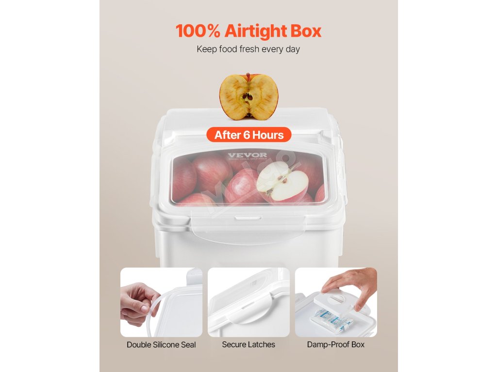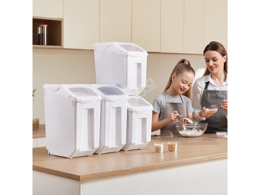 V závislosti od typu a hmotnosti vášho suchého tovaru sa do 15 l nádoby zmestí až 26 kg ryže alebo 13 kg krmiva pre domáce zvieratá; do 20 l nádoby sa zmestí až 35 kg ryže alebo 17 kg krmiva pre domáce zvieratá. Jeho stohovateľná konštrukcia vám umožní usporiadať si úložný priestor.