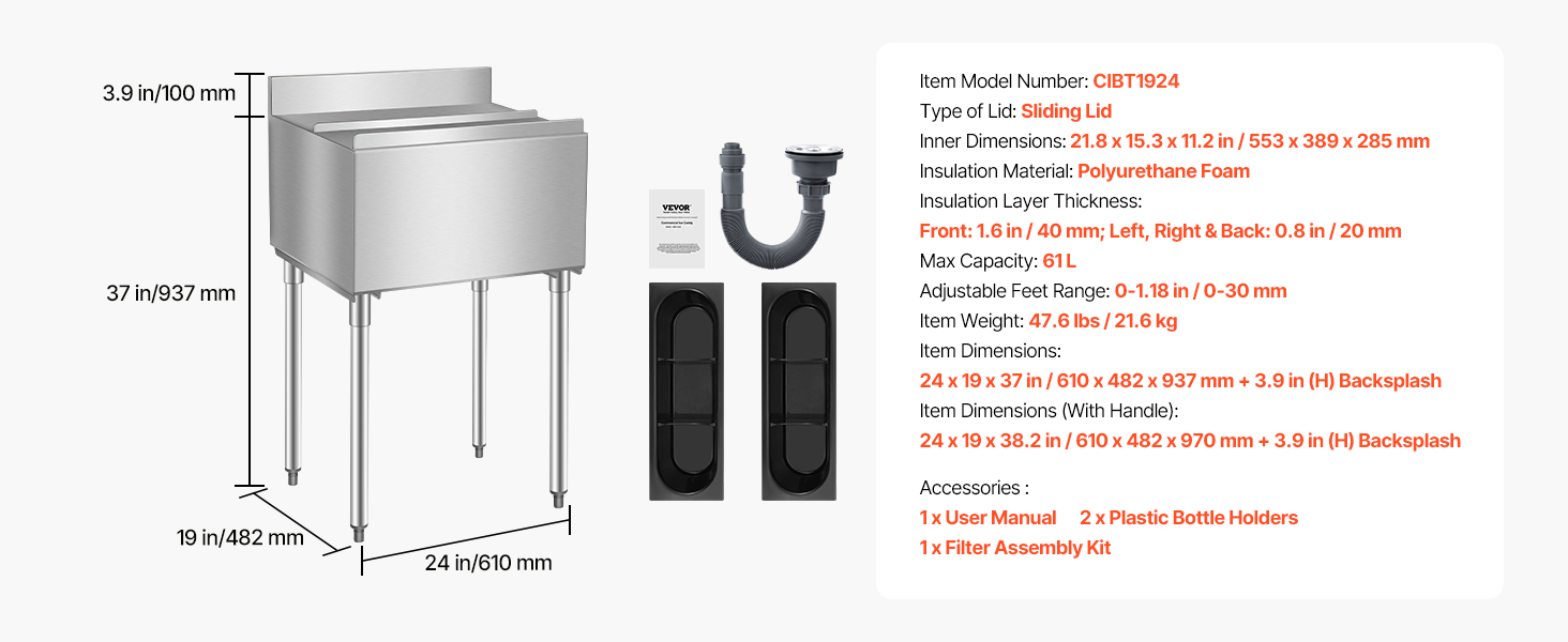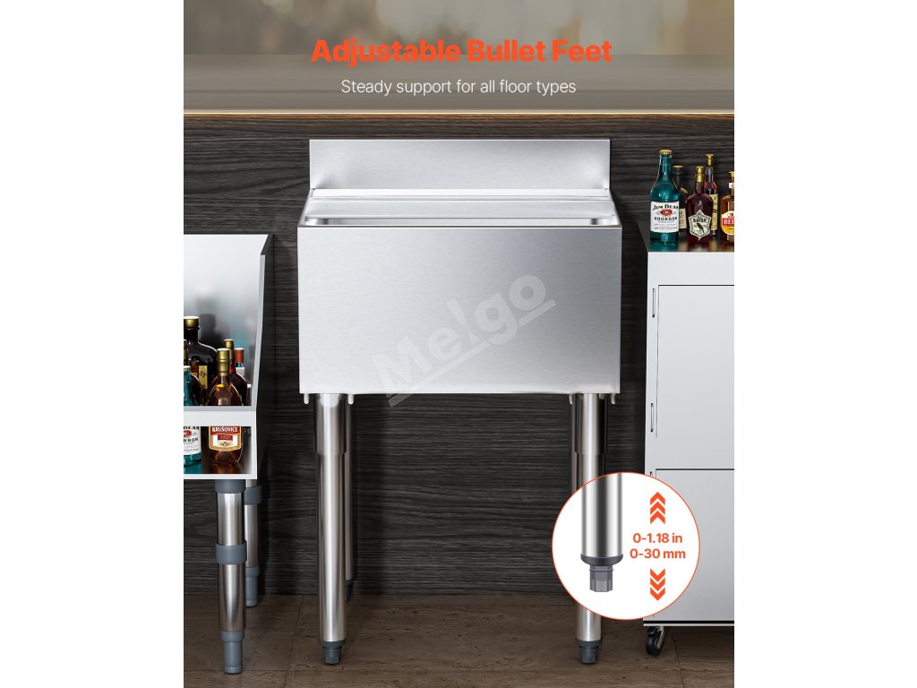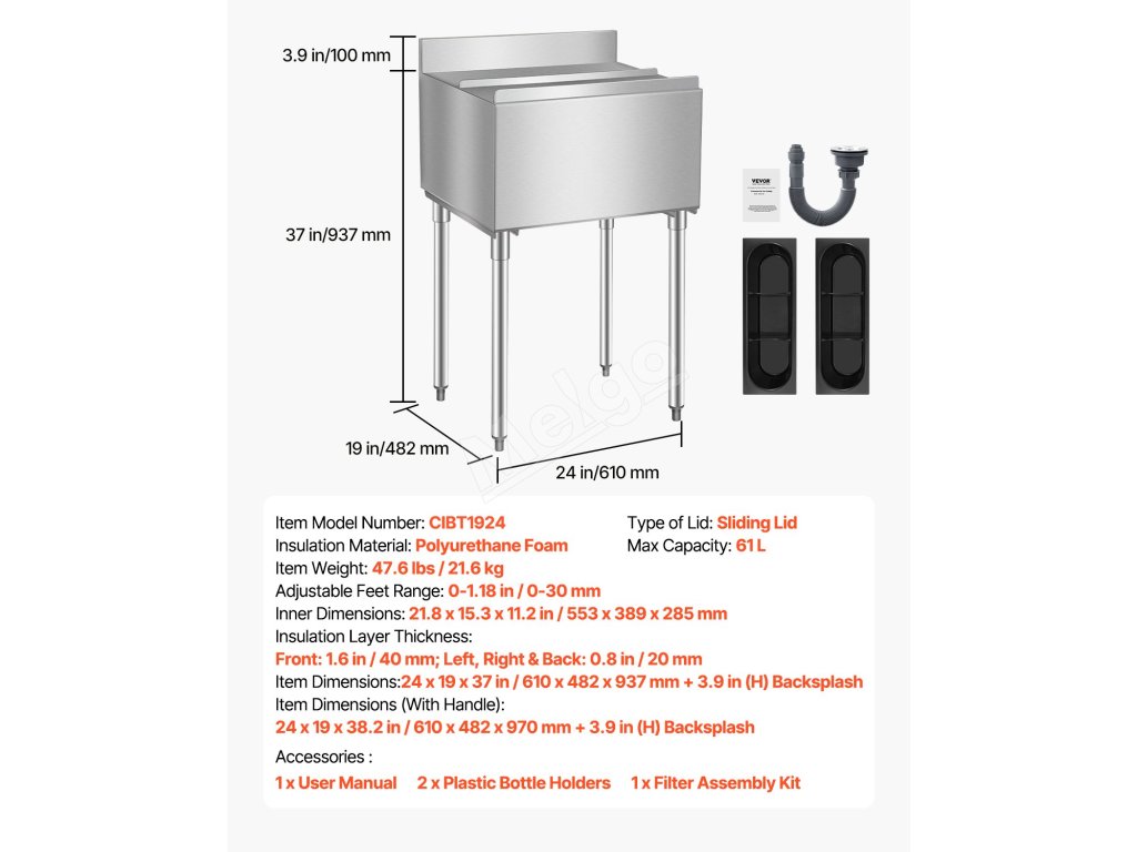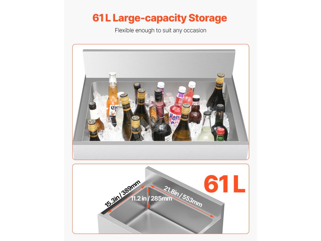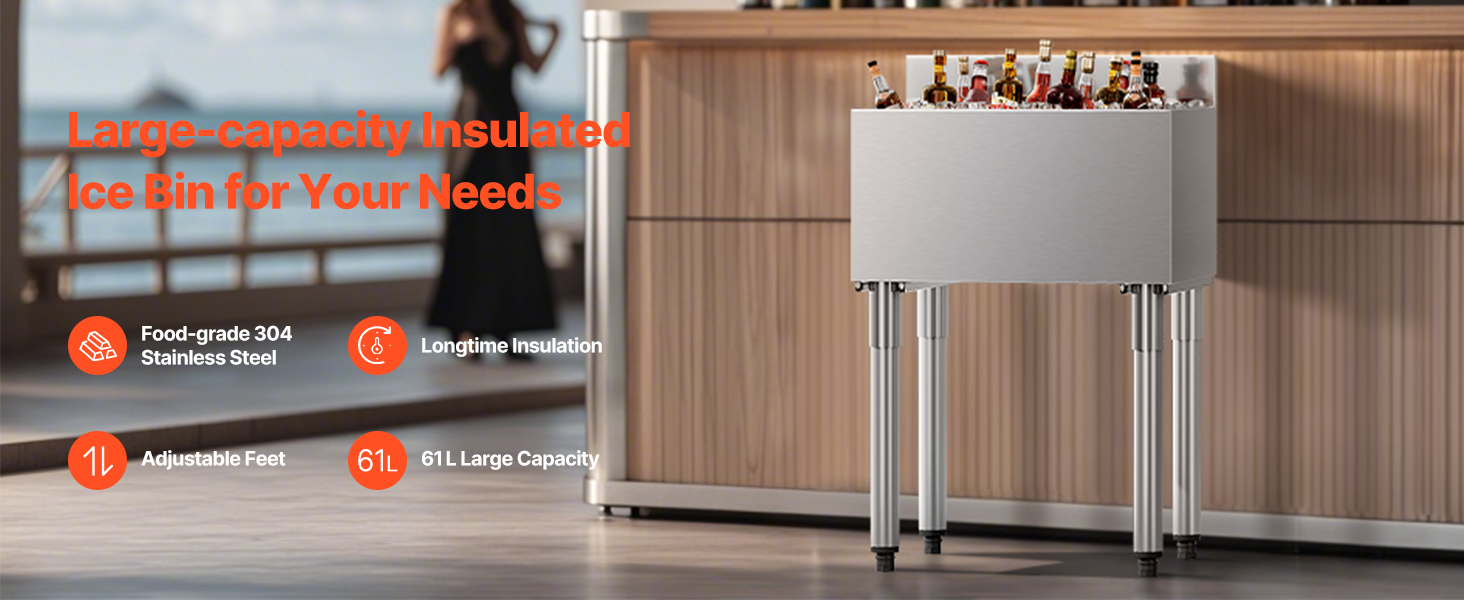 Náš komerčný zásobník na ľad s veľkou kapacitou 61 l spája vynikajúcu izoláciu s pohodlnou funkčnosťou. Je vyrobený z potravinárskej nehrdzavejúcej ocele 304 a zaručuje, že ľad zostane zmrazený až 24 hodín. Je vybavená nastaviteľnými nožičkami, vďaka ktorým sa prispôsobí rôznym povrchom, čo je ideálne na všestranné použitie.