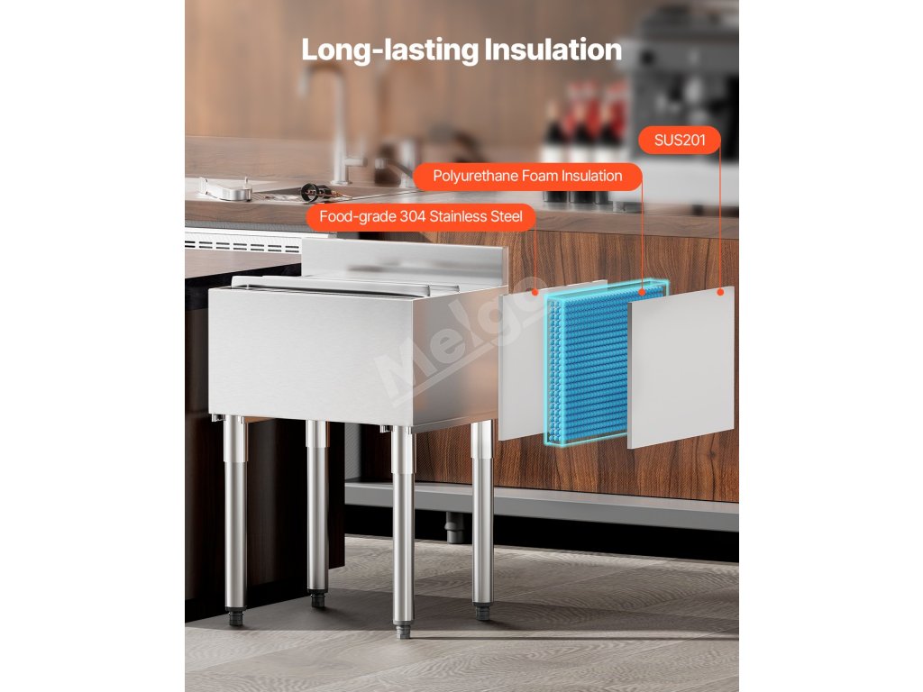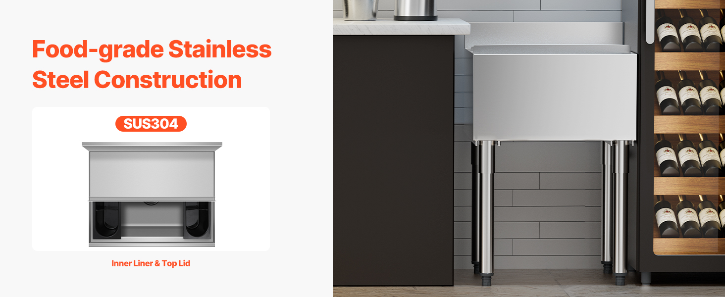 Náš zásobník na ľad pod barovým pultom je vyrobený z potravinárskej nehrdzavejúcej ocele 304. Jeho vnútorná vložka a veko sú vyrobené z potravinárskej nehrdzavejúcej ocele 304, ktorá zaručuje odolnosť a bezpečnosť. Certifikát NSF pre váš pokoj.