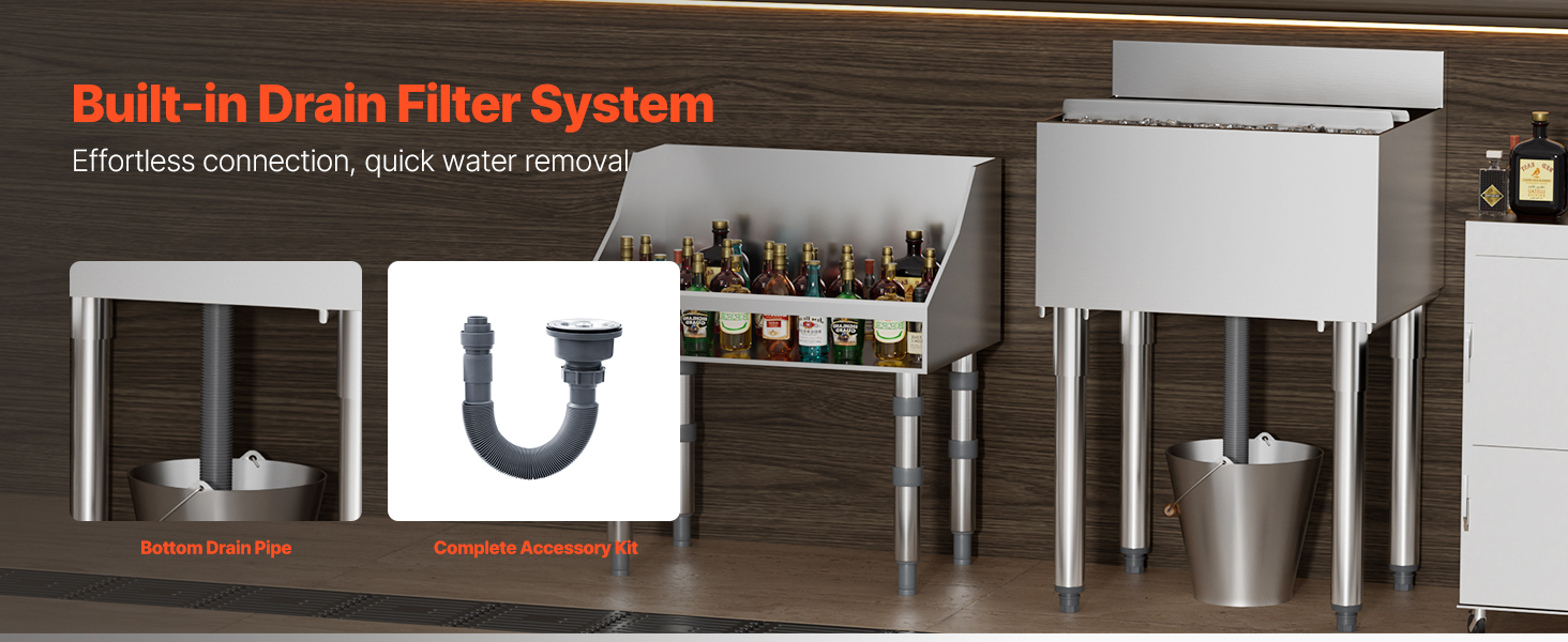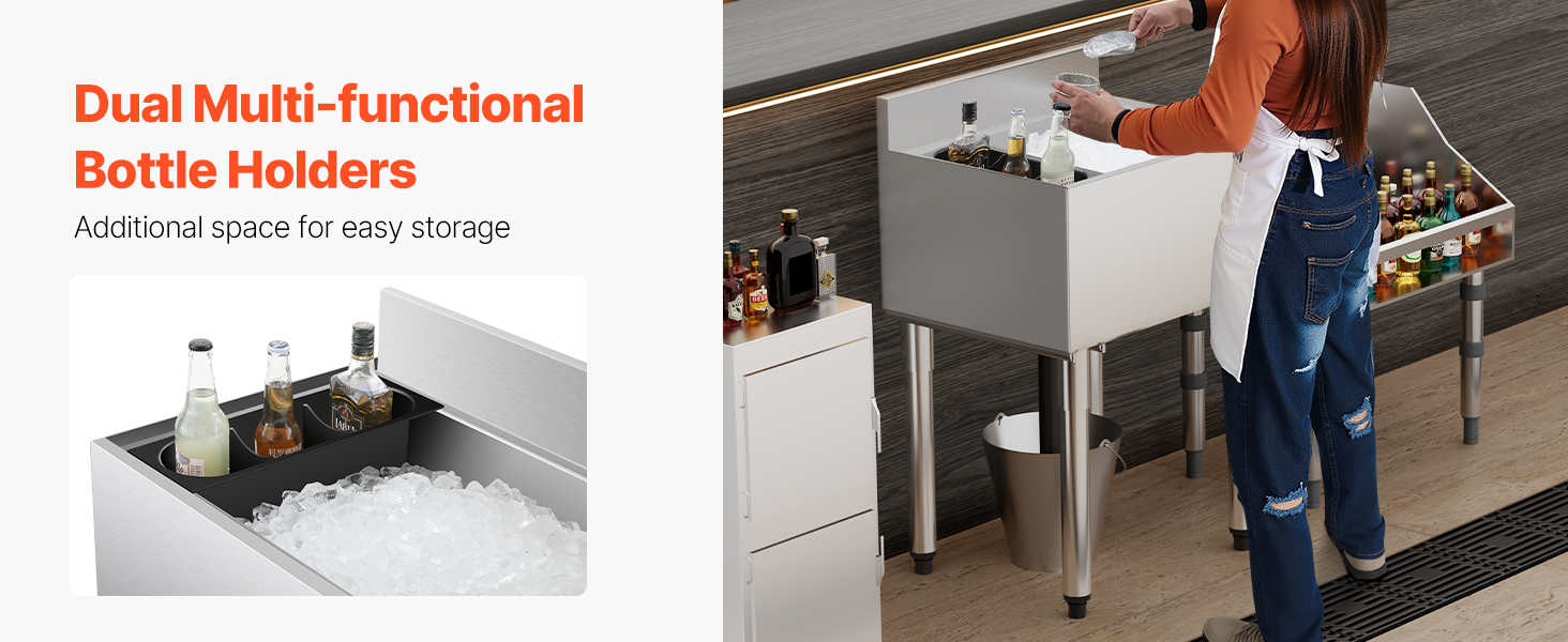 Náš komerčný zásobník na ľad pod barovým pultom sa dodáva s dvoma držiakmi na fľaše, z ktorých každý pojme tri fľaše. Vyrieši problém s uskladnením často používaných miešadiel alebo nápojov, zjednoduší proces skladovania a poskytne dodatočný priestor.
