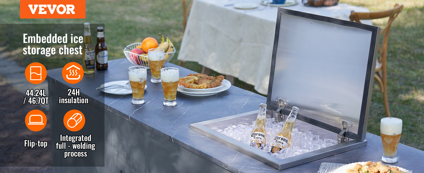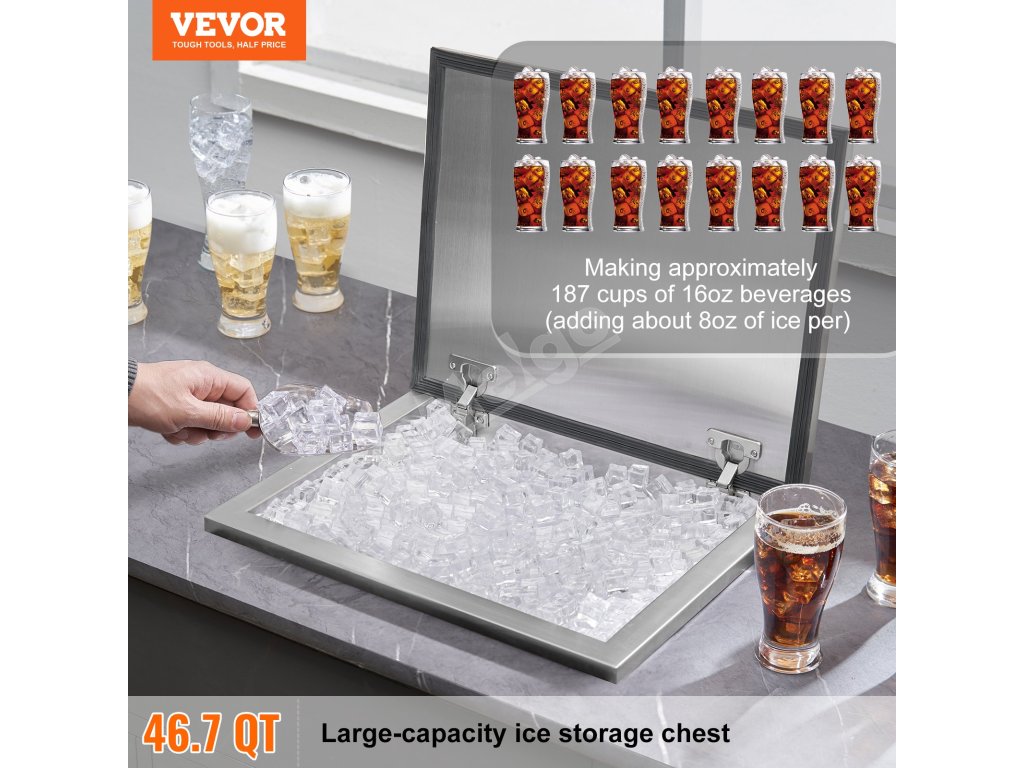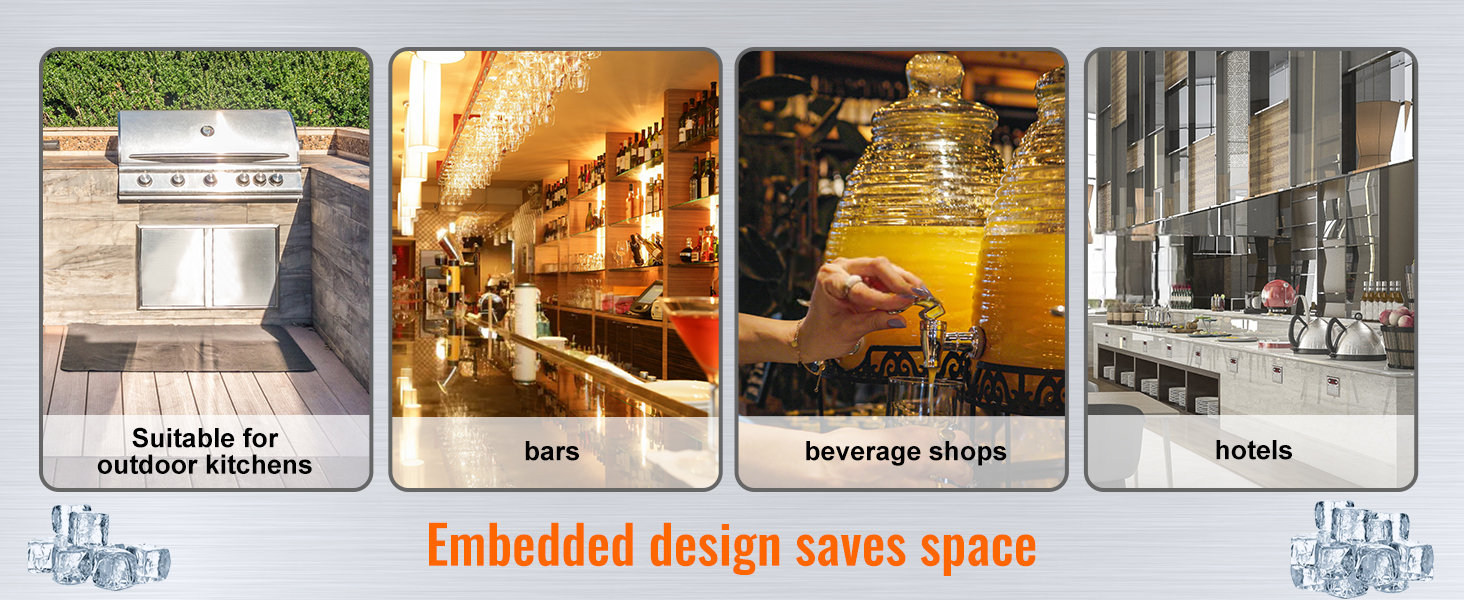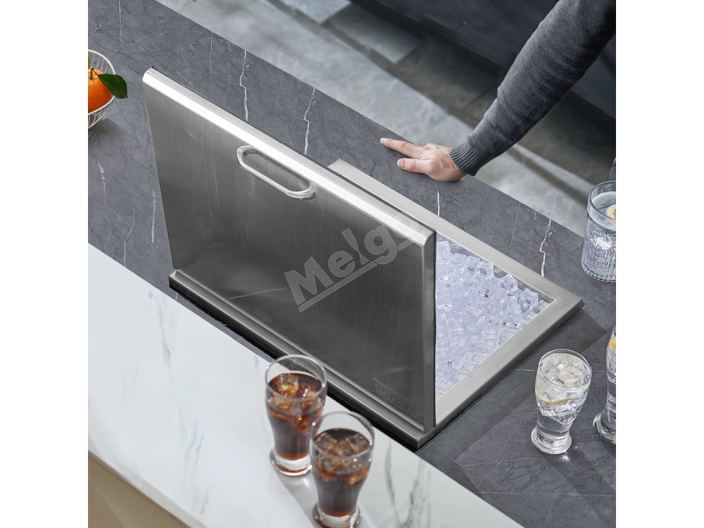 Konštrukcia na zabudovanie šetrí miesto, vďaka čomu je táto barová nádoba na ľad vhodná na použitie v pultoch predajní s nápojmi, hoteloch, vonkajších reštauráciách, baroch a na iných miestach.