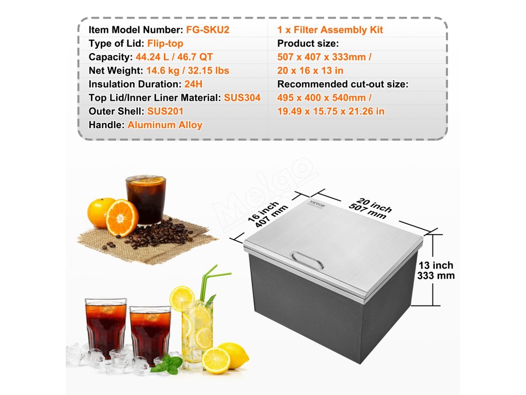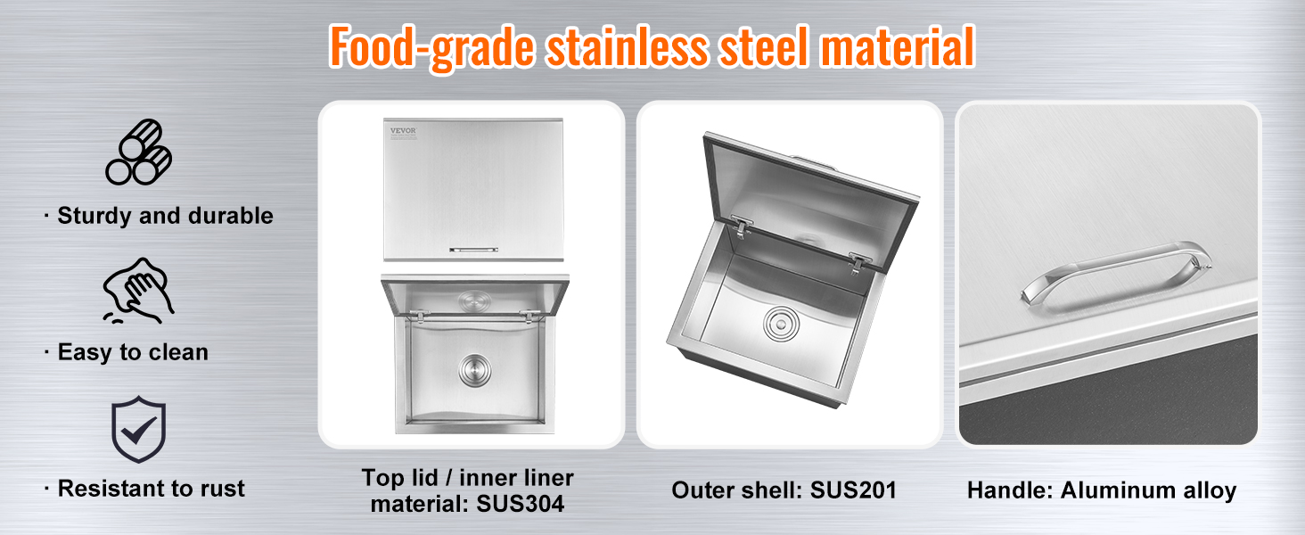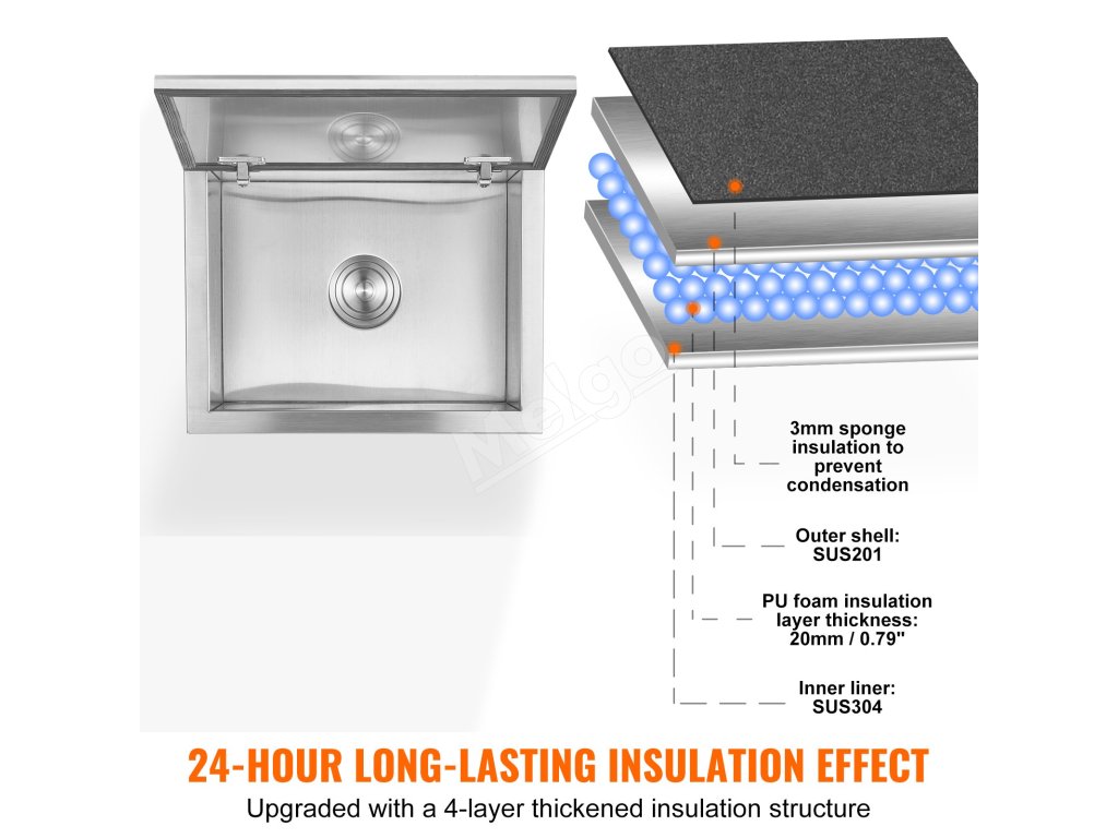 Vnútorná vložka a veko sú vyrobené z nehrdzavejúcej ocele SUS304 a vonkajší plášť z nehrdzavejúcej ocele SUS201. Kombinácia tejto chladničky na ľad ponúka odolnosť a jednoduché čistenie na bezpečné a zaručené používanie.