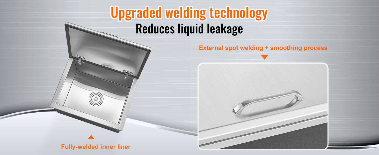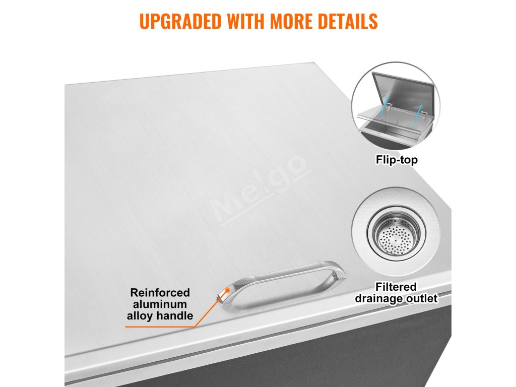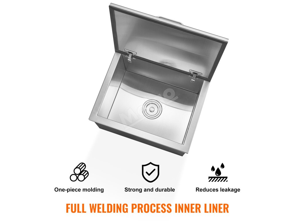Truhlica na ľad z nehrdzavejúcej ocele je vybavená kompletnou sadou odtokového príslušenstva na jednoduchú inštaláciu a používanie, ktorá umožňuje rýchle odvádzanie vody a udržiavanie čistoty vo vnútri truhlice.