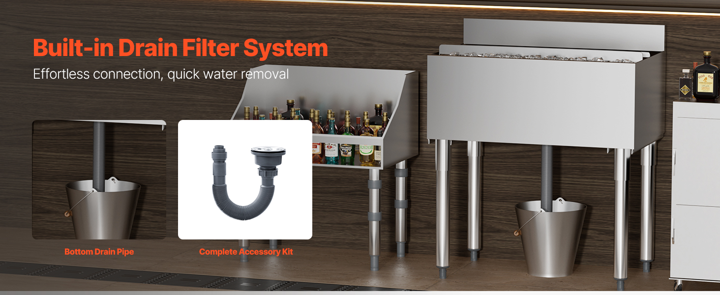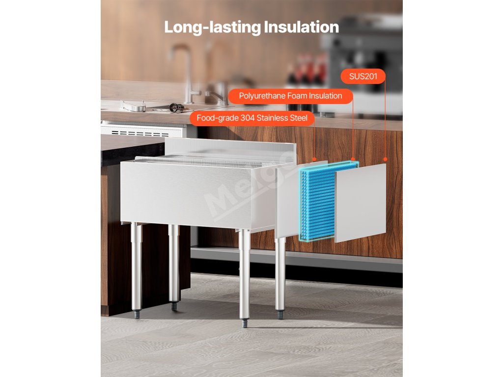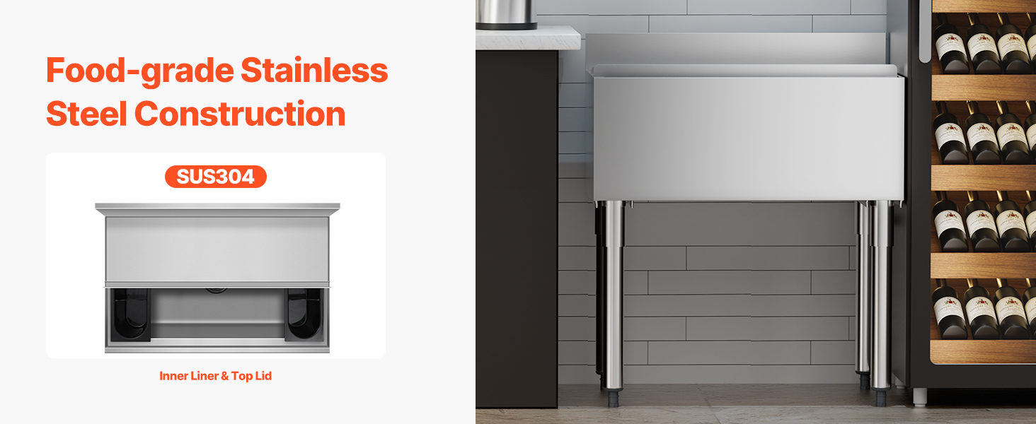 Náš zásobník na ľad pod barovým pultom je vyrobený z potravinárskej nehrdzavejúcej ocele 304. Jeho vnútorná vložka a veko sú vyrobené z potravinárskej nehrdzavejúcej ocele 304, ktorá zaručuje odolnosť a bezpečnosť. Certifikát NSF pre váš pokoj.