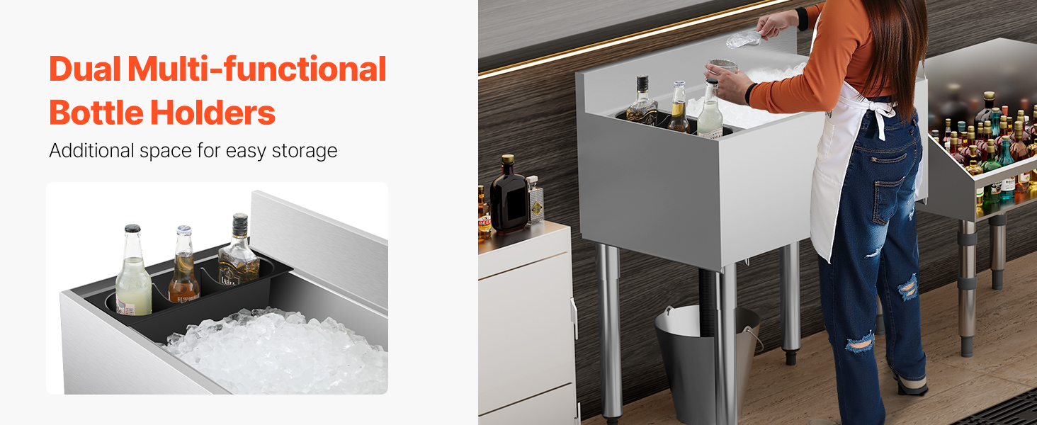 Náš komerčný zásobník na ľad pod barovým pultom sa dodáva s dvoma držiakmi na fľaše, z ktorých každý pojme tri fľaše. Vyrieši problém s uskladnením často používaných miešadiel alebo nápojov, zjednoduší proces skladovania a poskytne dodatočný priestor.