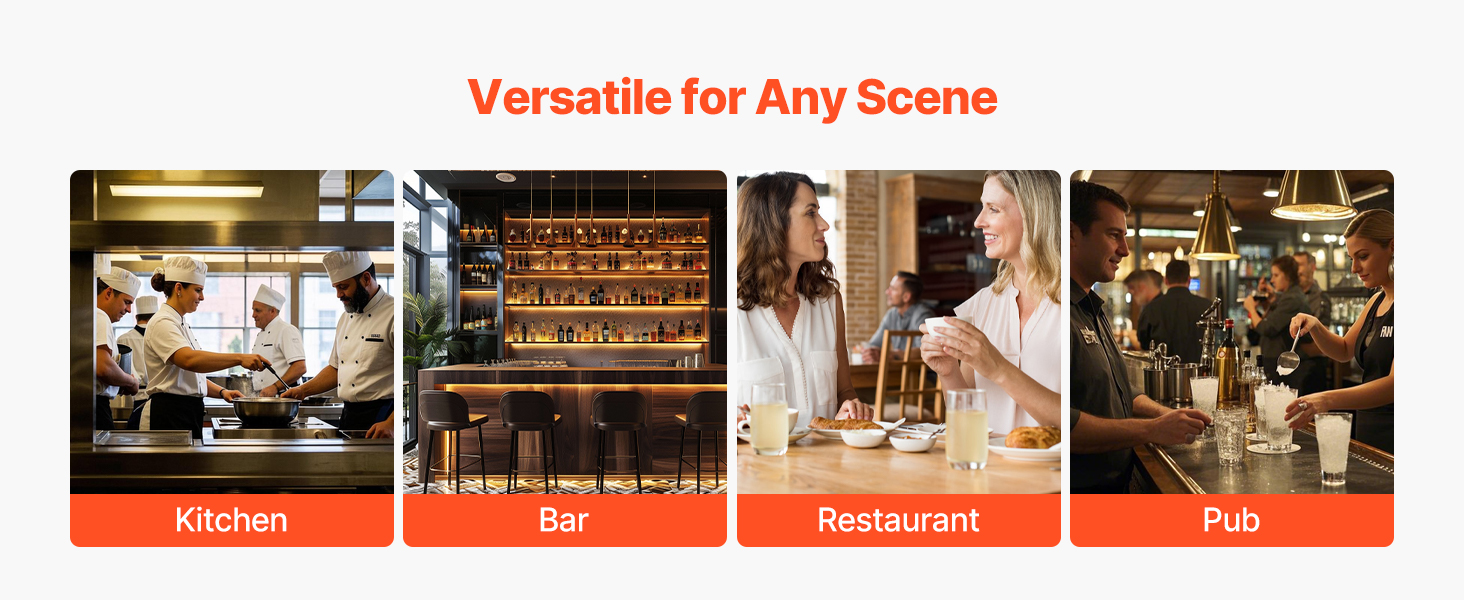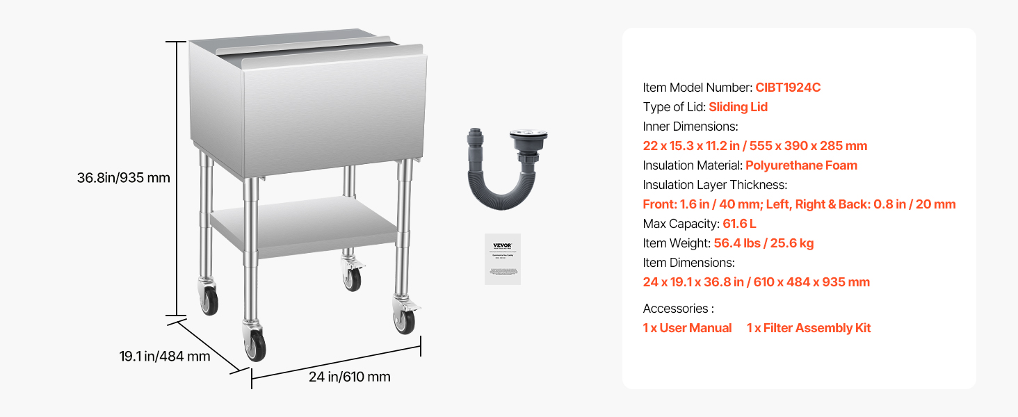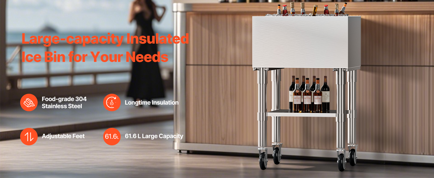 Náš komerčný zásobník na ľad s veľkou kapacitou 61,6 l kombinuje vynikajúcu izoláciu s pohodlnou funkčnosťou. Je vyrobený z potravinárskej nehrdzavejúcej ocele 304 a zaručuje, že ľad zostane zmrazený až 24 hodín. Je vybavená nastaviteľnými nožičkami, vďaka ktorým sa prispôsobí rôznym povrchom, čo je ideálne na všestranné použitie.