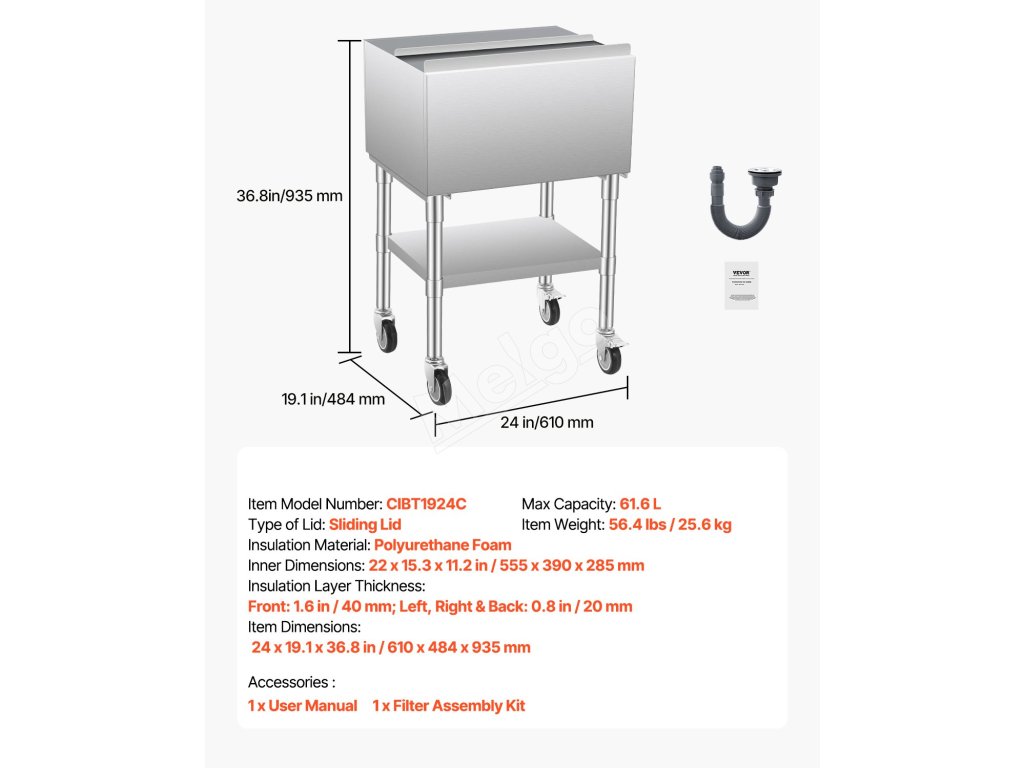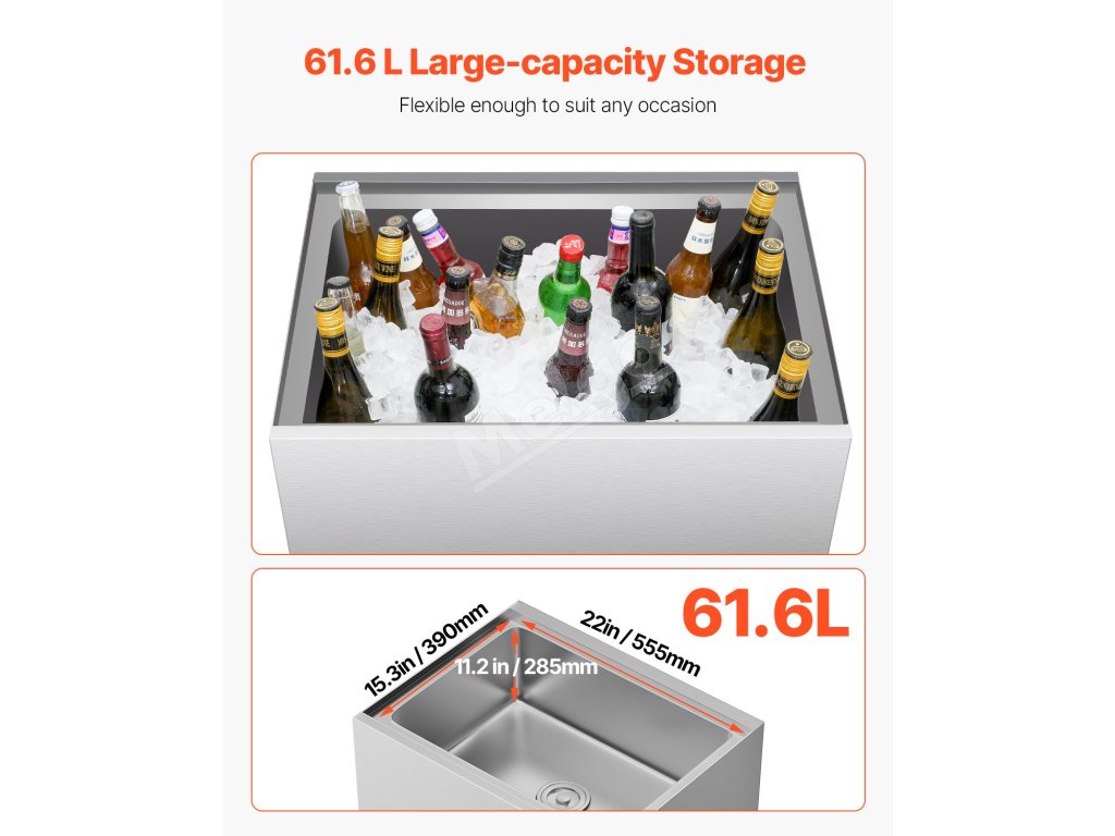 Náš komerčný zásobník na ľad s veľkou kapacitou 61,6 l kombinuje vynikajúcu izoláciu s pohodlnou funkčnosťou. Je vyrobený z potravinárskej nehrdzavejúcej ocele 304 a zaručuje, že ľad zostane zmrazený až 24 hodín. Je vybavená nastaviteľnými nožičkami, vďaka ktorým sa prispôsobí rôznym povrchom, čo je ideálne na všestranné použitie.