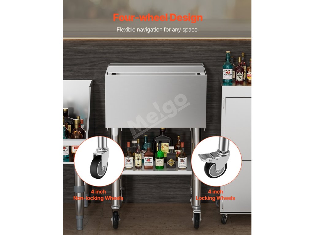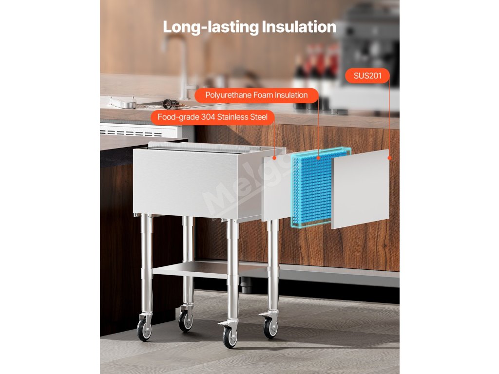 Vynikajúce riešenie pre kuchyne, bary, reštaurácie a pohostinstvá. Vďaka účinnej izolácii a odolnej konštrukcii z nehrdzavejúcej ocele náš stojanový chladiaci vozík zaručuje, že váš ľad a nápoje zostanú pri ideálnej teplote, čím spĺňa požiadavky rôznych komerčných prostredí.