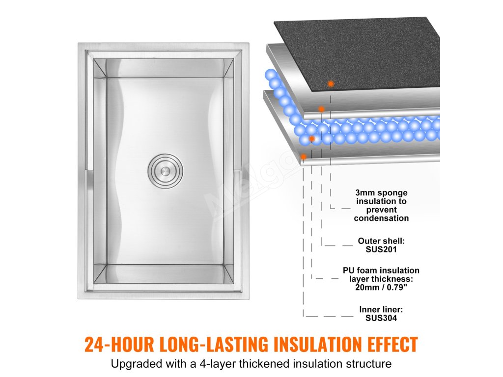 Veľkokapacitná vhadzovacia nádoba na ľad z nehrdzavejúcej ocele, ktorá dokáže pojať značné množstvo ľadu a dokonale splní vaše komerčné a domáce potreby. Je vybavená 20 mm / 0,79" hrubšou izolačnou vrstvou z PU peny, ktorá zabezpečuje viac ako 24 hodín izolácie.