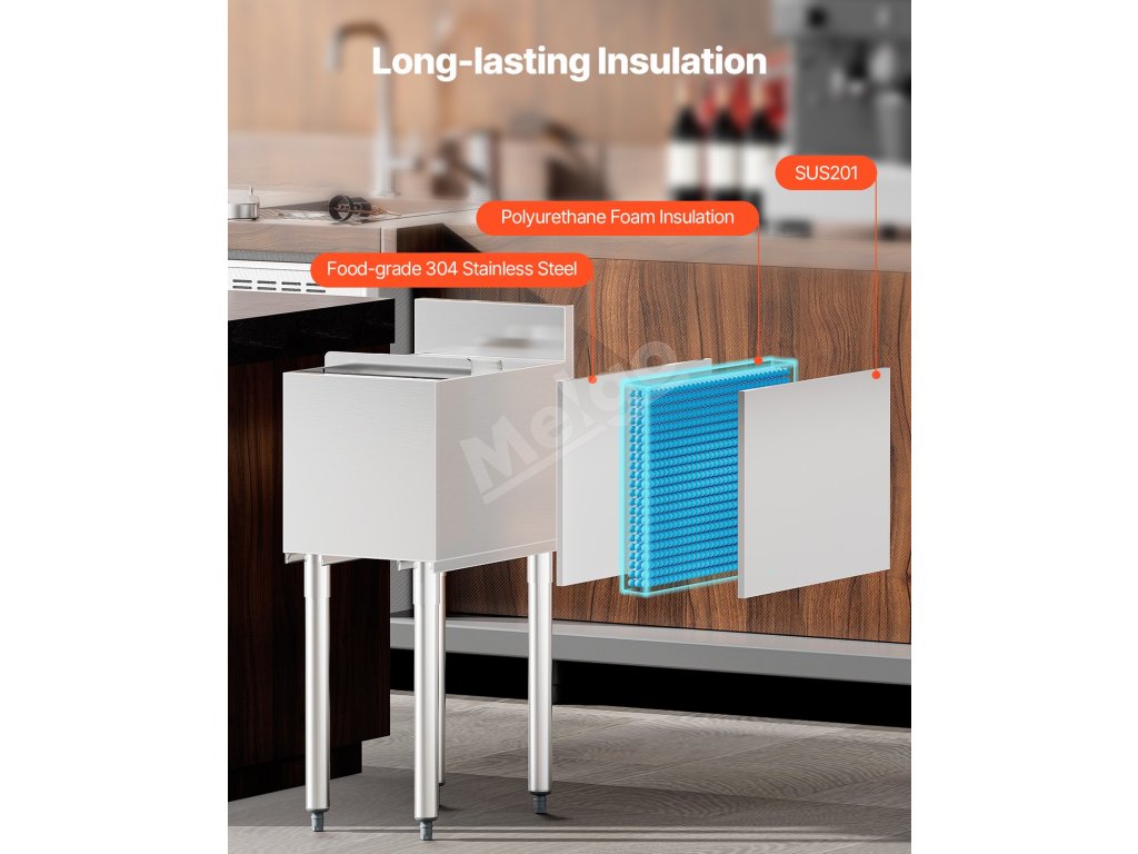 Náš zásobník na ľad pod barovým pultom je vyrobený z potravinárskej nehrdzavejúcej ocele 304. Jeho vnútorná vložka a veko sú vyrobené z potravinárskej nehrdzavejúcej ocele 304, ktorá zaručuje odolnosť a bezpečnosť. Certifikát NSF pre váš pokoj.