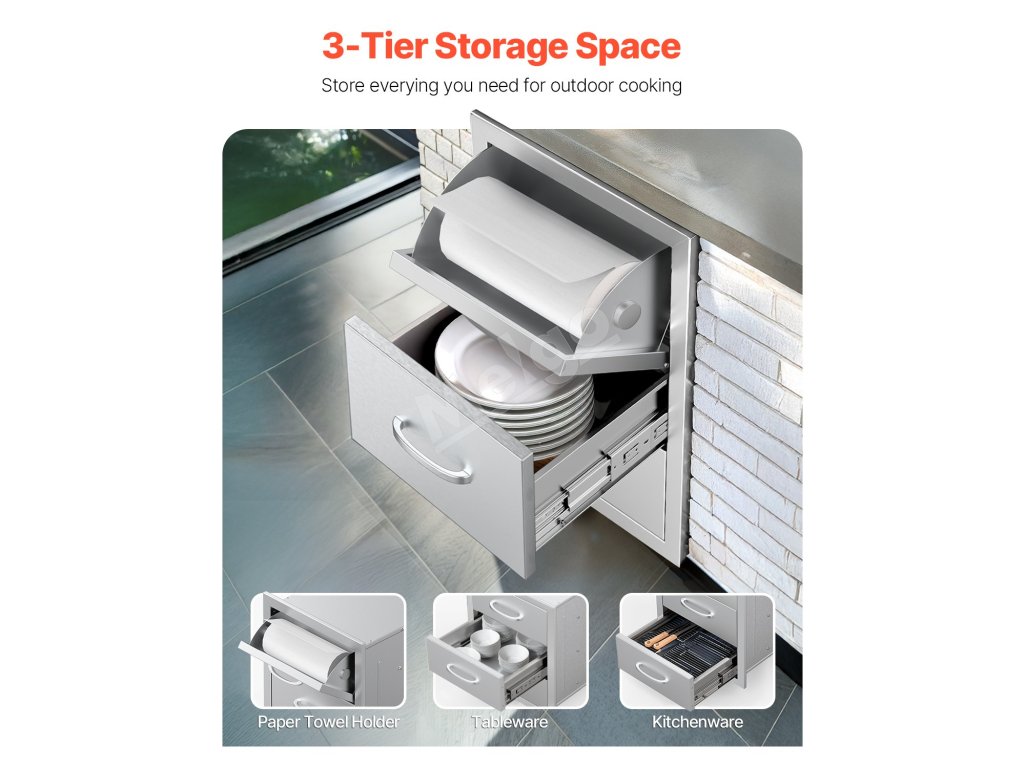 Táto kombinovaná vonkajšia zásuvka je plná priestoru. Umožní vám pojať viac kuchynského náradia a ponúka praktické úložné priestory.