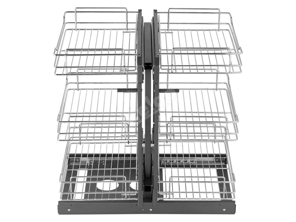 Otočný kôš je vyrobený s vysokokvalitným rámom z uhlíkovej ocele, je pevný a odolný, s veľkou nosnosťou, bezpečne udrží ťažké hrnce aj veľké riady. Chrómovanie spĺňa normu odolnosti proti korózii úrovne 8, vďaka čomu zostane polička na leňošenie dlho lesklá a nová.