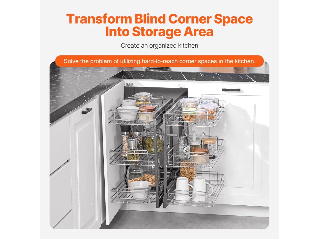 Náš organizér do slepého rohu je navrhnutý tak, aby riešil slepé miesta v rohu kuchyne a pomohol vám efektívne využiť priestor. Vďaka veľkokapacitnému dizajnu môžete ľahko ukladať rôzne kuchynské predmety, čo vám umožní ich plynulé vyťahovanie bez obáv o ťažko prístupné rohové predmety.