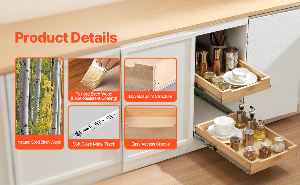 Masívna drevená konštrukcia výsuvného organizéra do kuchynskej skrinky zaručuje pevnosť a dlhodobú životnosť. Je vyrobený z brezového dreva a dodá vašej kuchyni elegantný vzhľad. Laková vrstva zabraňuje vyblednutiu dreva, zatiaľ čo štruktúra holubičieho chvosta poskytuje zvýšenú odolnosť.