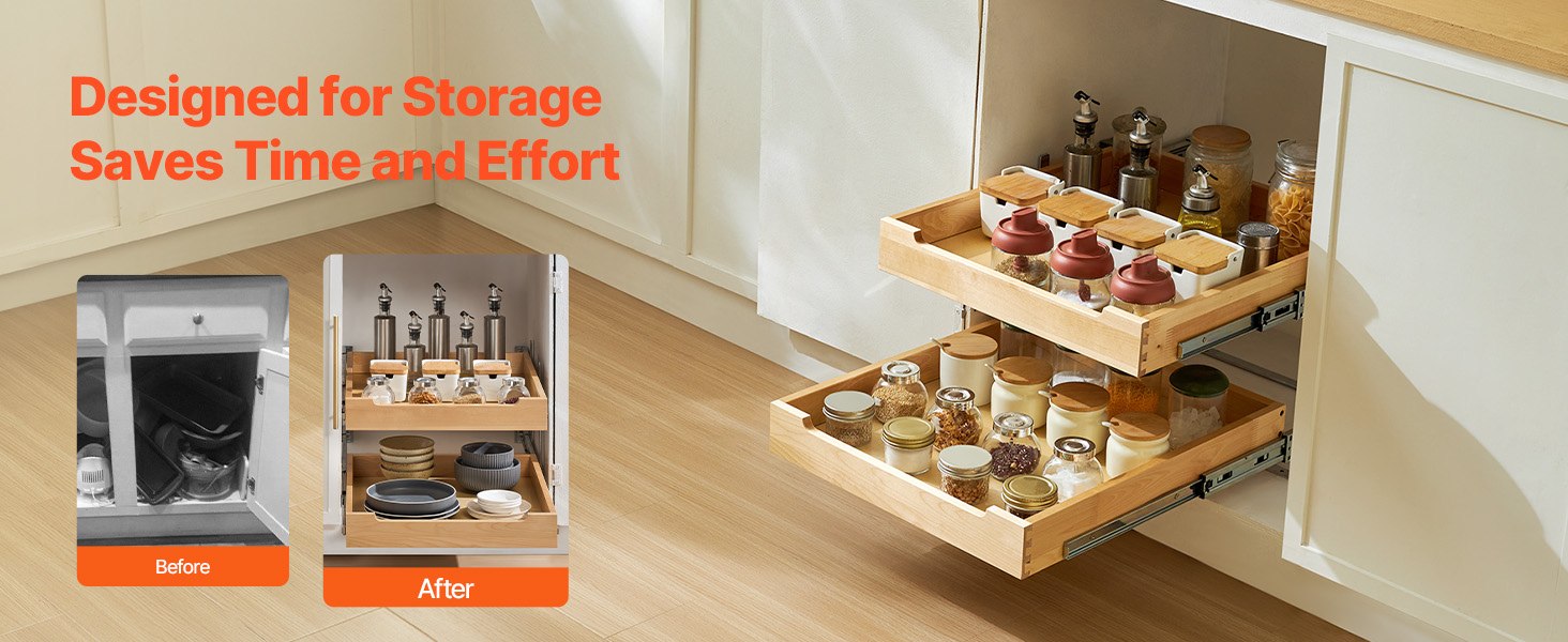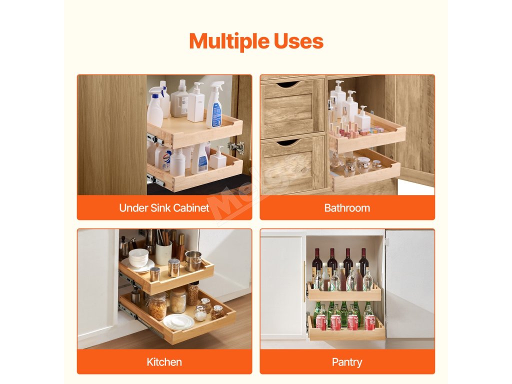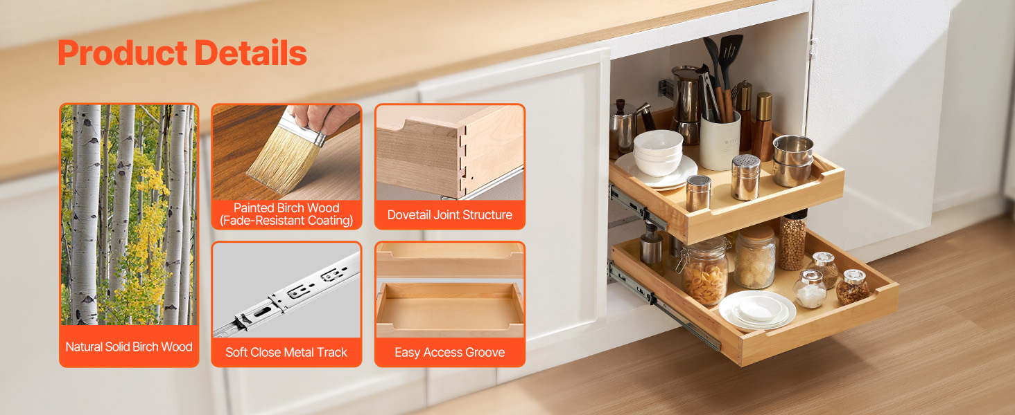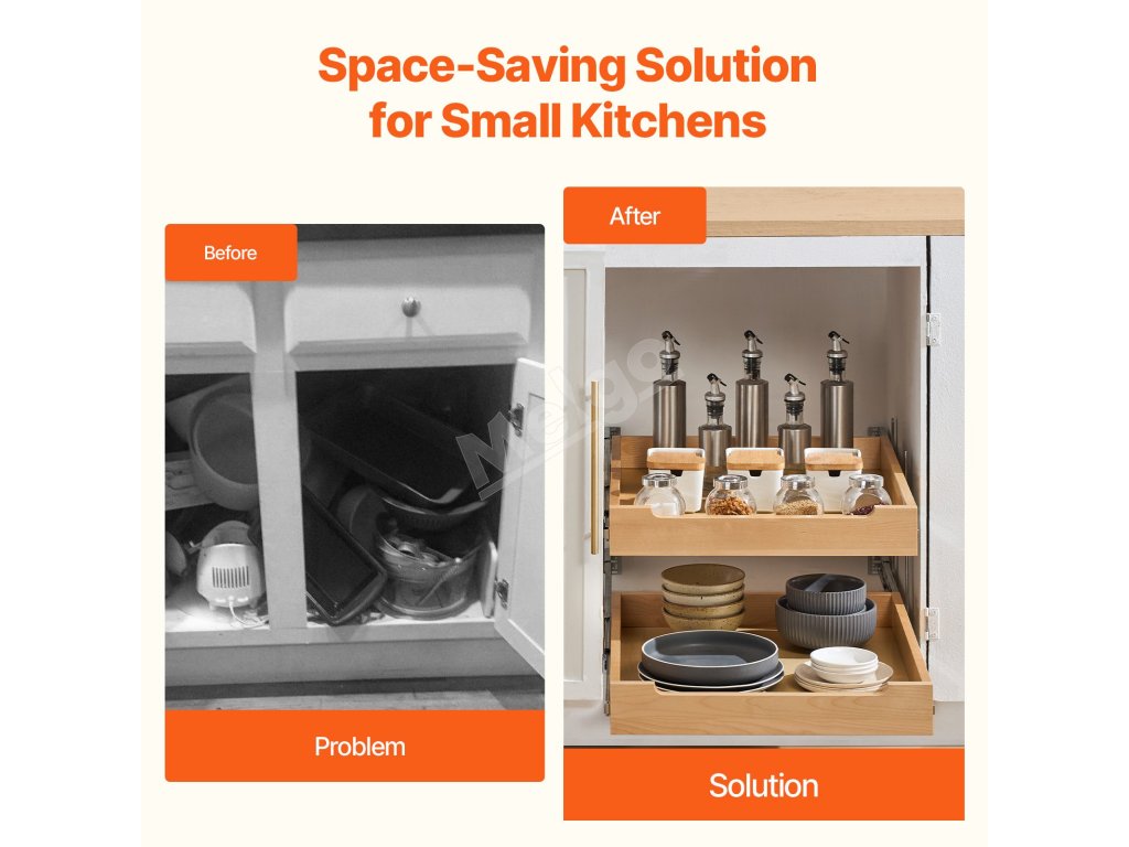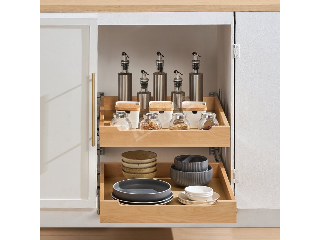 Táto výsuvná drevená polica s mäkkým zatváraním je ideálna na použitie v skriniach, skriniach pod umývadlom a úložných skrinkách. Maximalizuje využitie priestoru a uľahčuje ukladanie a prístup k hrncom, panviciam a kuchynskému náradiu. Jej elegantný a nadčasový dizajn krásne doplní každú kuchyňu.