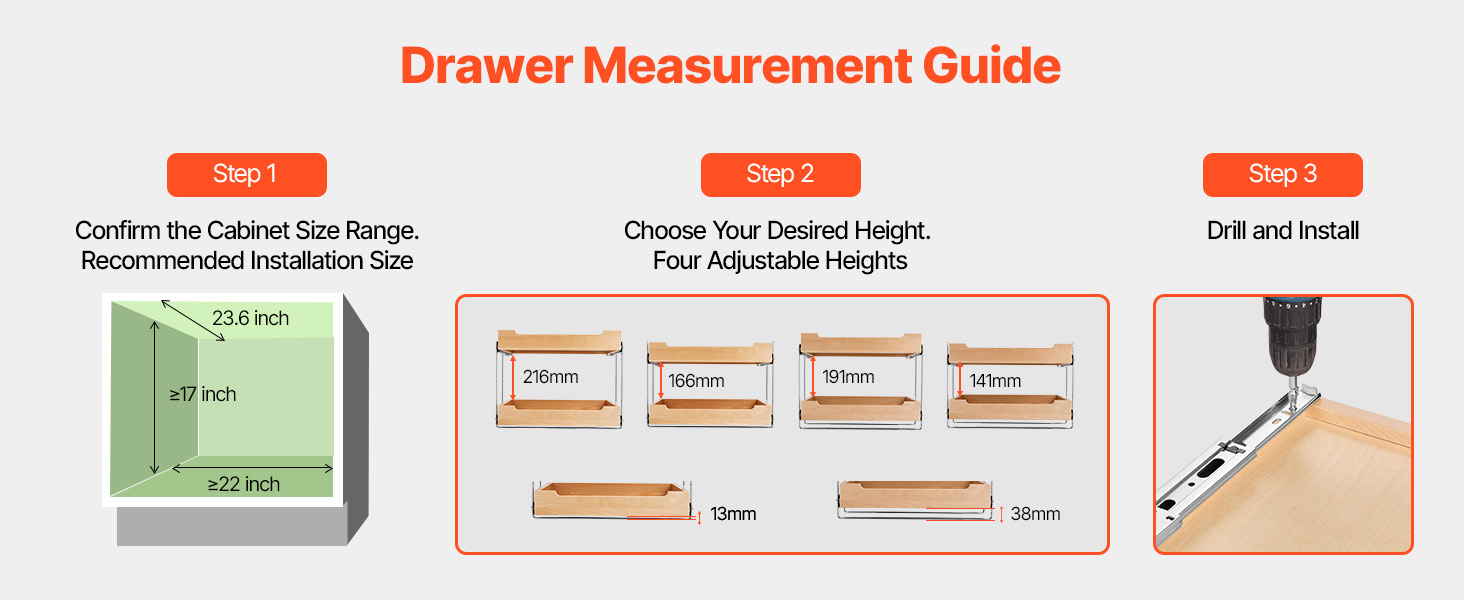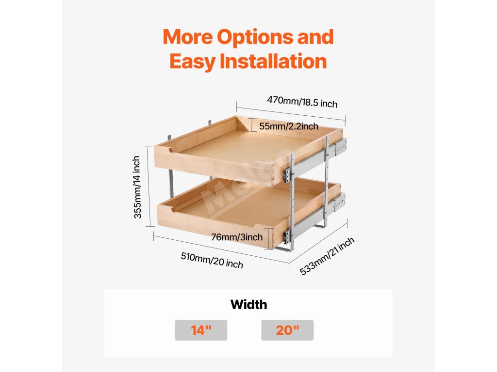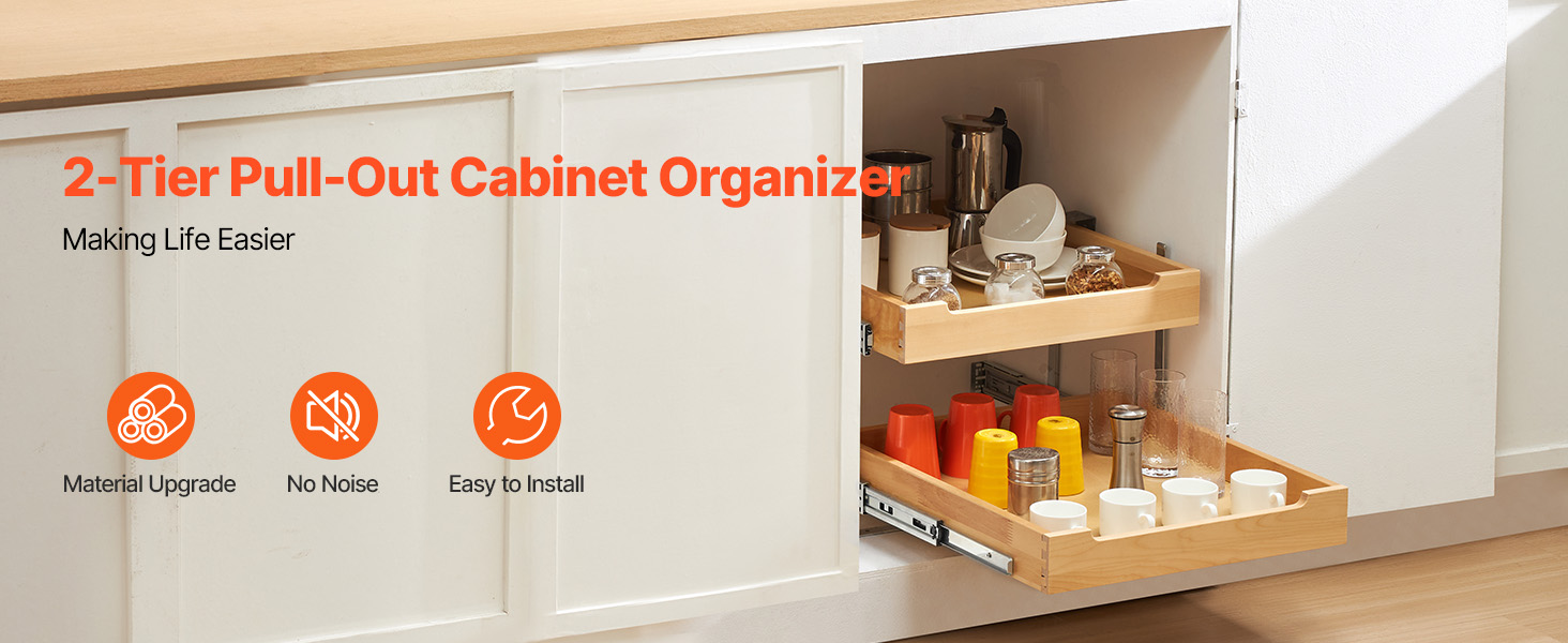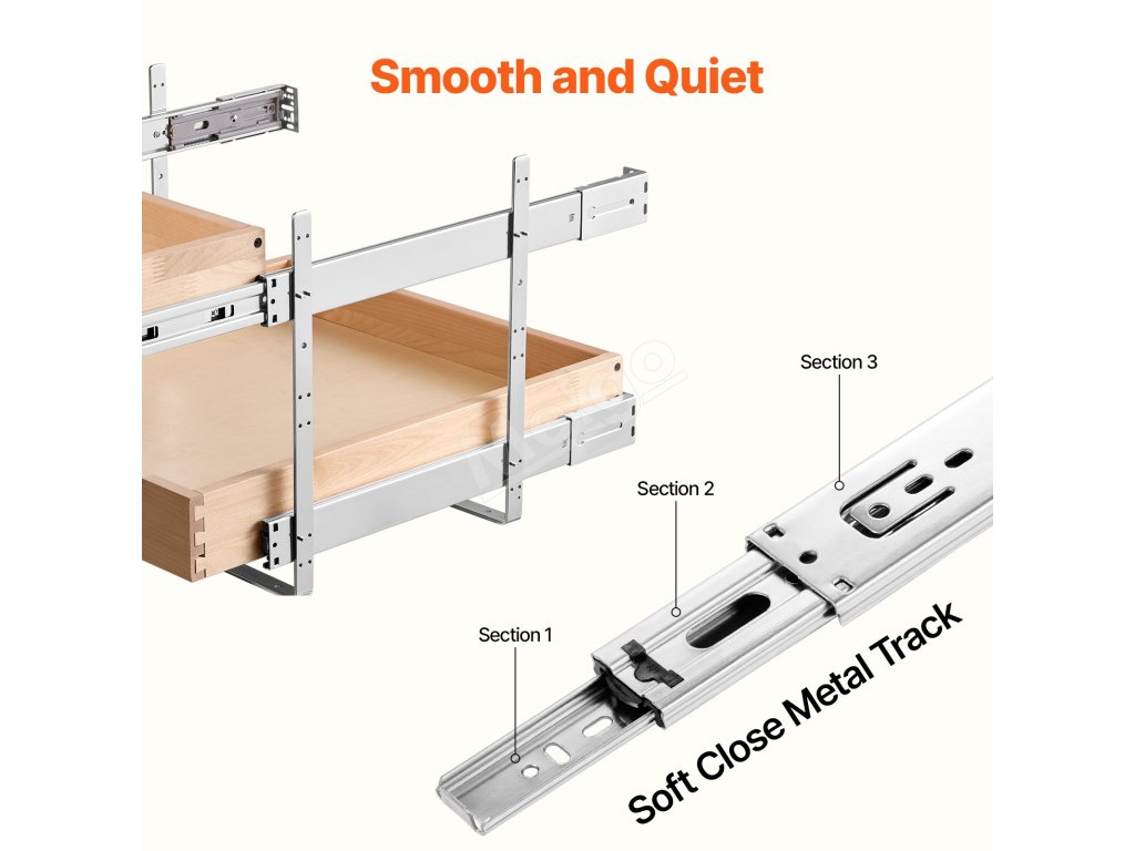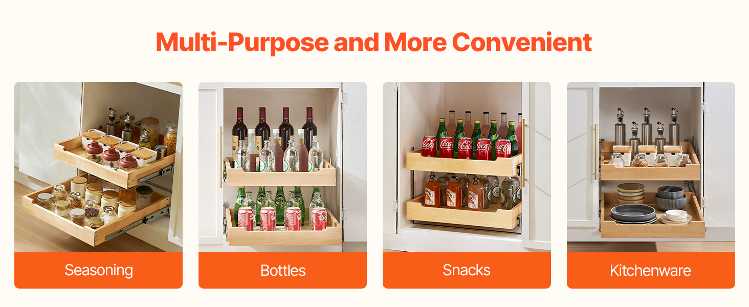 Táto výsuvná drevená polica s mäkkým zatváraním je ideálna na použitie v skriniach, skriniach pod umývadlom a úložných skrinkách. Maximalizuje využitie priestoru a uľahčuje ukladanie a prístup k hrncom, panviciam a kuchynskému náradiu. Jej elegantný a nadčasový dizajn krásne doplní každú kuchyňu.