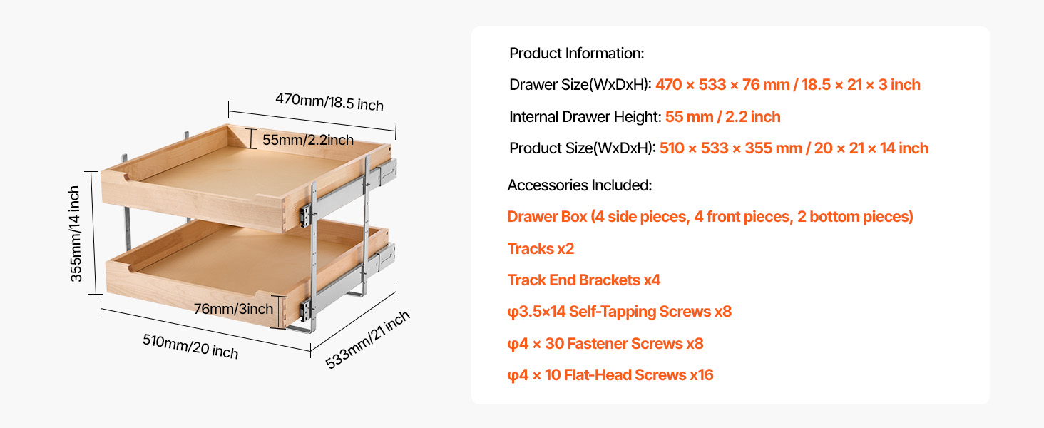 Rozmer zásuvky: 470 x 533 x 76 mm. Vnútorná výška zásuvky: 55 mm. Naša ťažká výsuvná zásuvka z dreva je priestorovo úsporné riešenie s veľkou úložnou kapacitou.