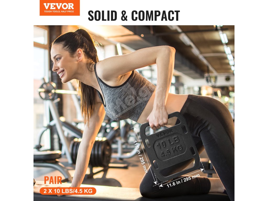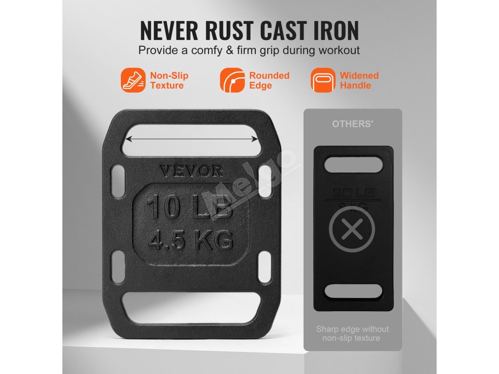 Tieto záťažové dosky sú vyrobené z veľkorozmernej liatiny s čiernou farbou na ich povrchu, ktorá chráni pred hrdzou. Má protišmykový povrch, zaoblené hrany a rozšírenú rukoväť pre bezpečné uchopenie počas každého pohybu.