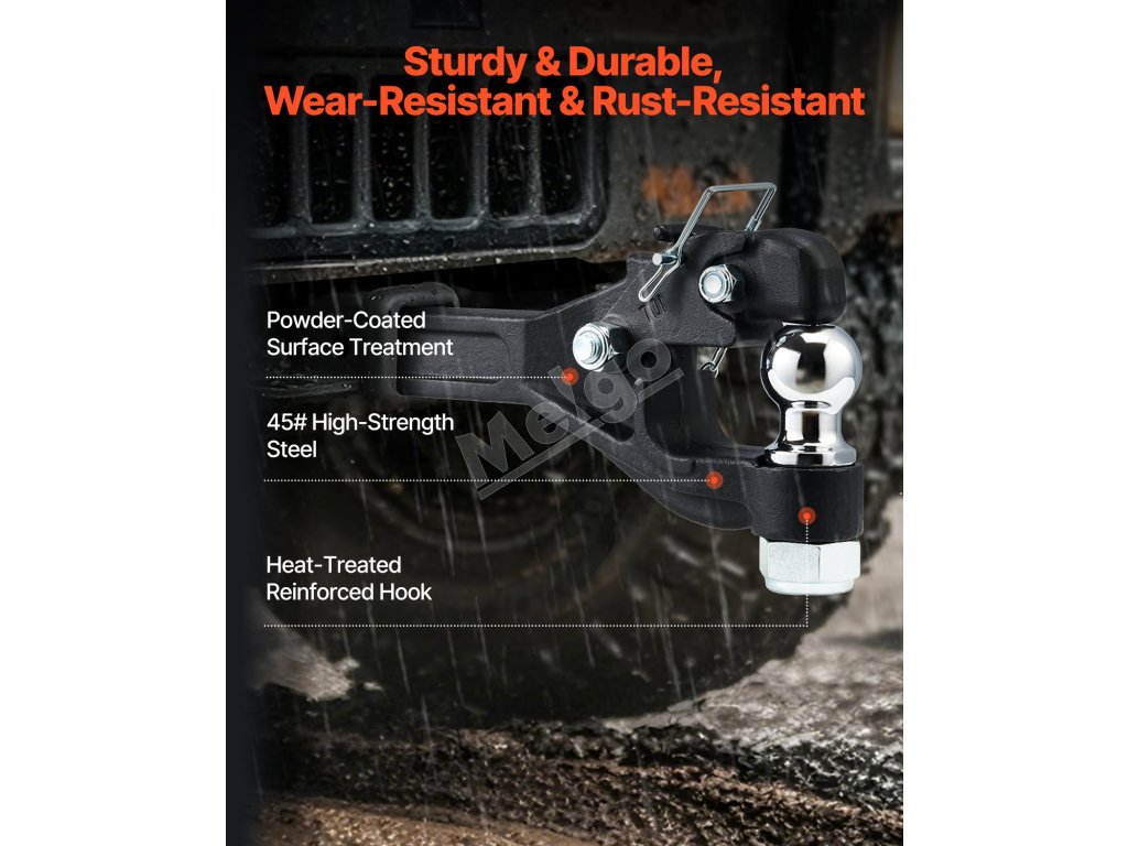 Pintle Hitch je vyrobený z vysoko kvalitnej ocele s práškovou povrchovou úpravou a poskytuje vynikajúcu odolnosť proti opotrebeniu a ochranu proti korózii.