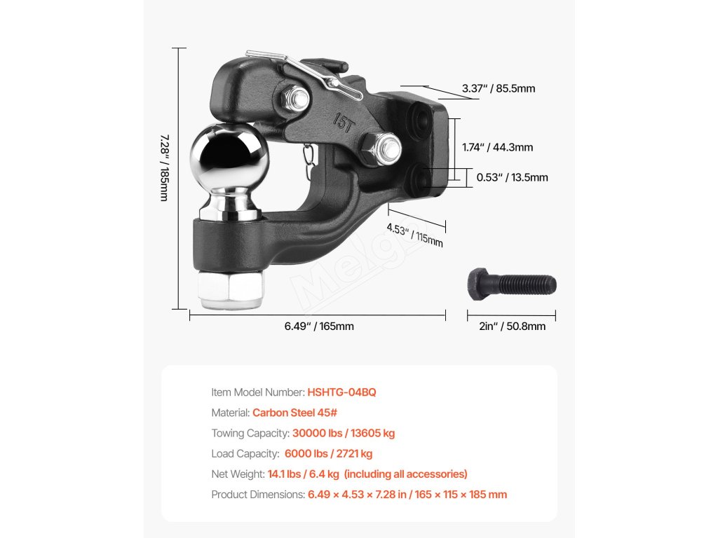 Pintlový hák 30000 lbs, 2-5/16-inch guľa, pre 2.5–3-inch očko, montáž