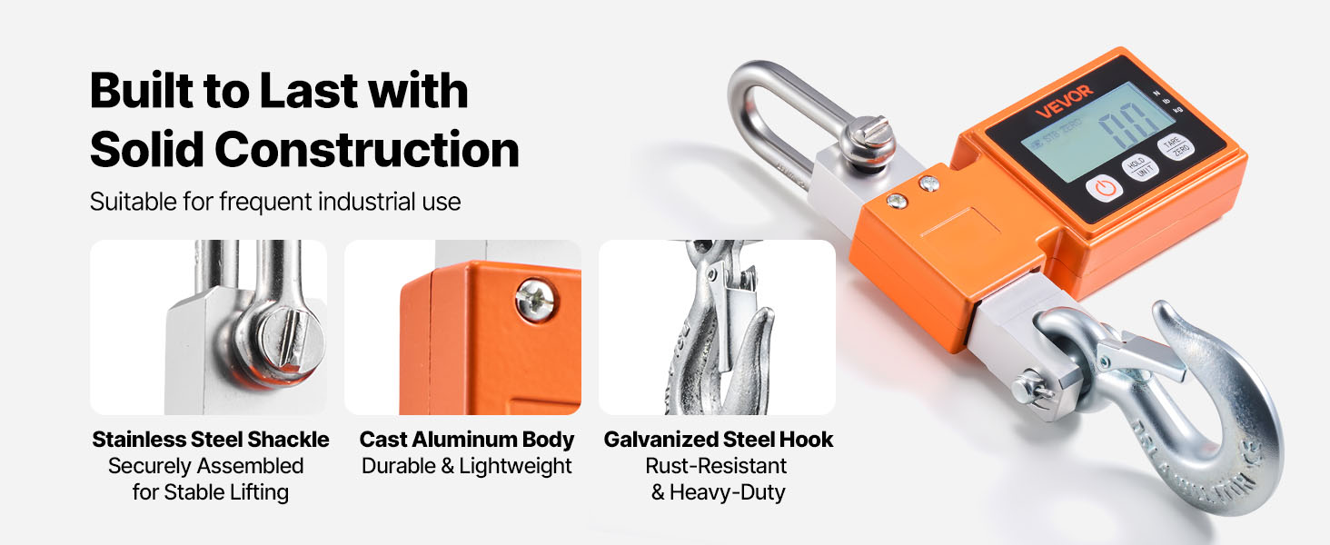 Táto digitálna žeriavová váha kombinuje telo z liateho hliníka s nerezovým okom a pozinkovaným oceľovým hákom. Odolná kombinácia odoláva deformácii a korózii, čím pomáha udržať zavesené bremená v bezpečí – pri každej úlohe.