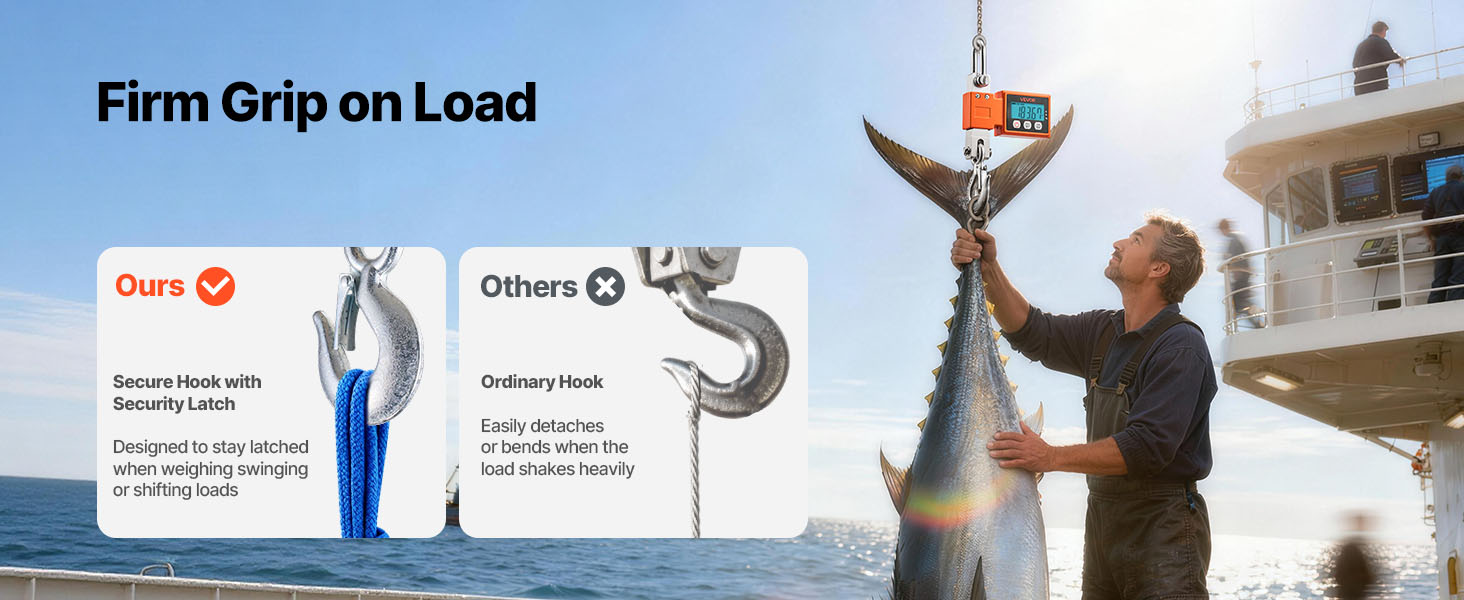 Tento ťažký hák je vybavený bezpečnostnou západkou, ktorá pomáha zabrániť skĺznutiu pri kolísaní nákladu. Zdvíhate, vážite a spúšťate s pevnejšou a bezpečnejšou kontrolou od začiatku do konca.