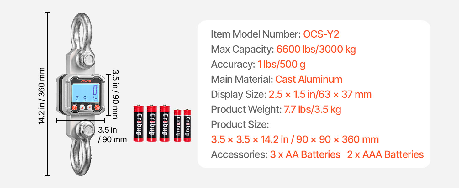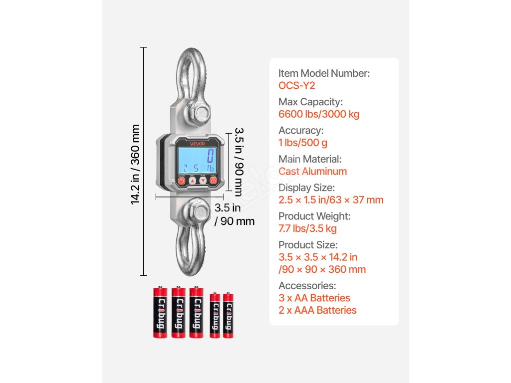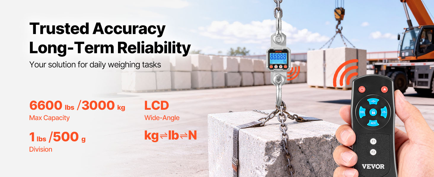 Táto žeriavová váha spája vysokú kapacitu s ostrým rozlíšením. Citlivý senzor meria s presnosťou 1 lb/500 g, takže môžete s rovnakou istotou sledovať malé zmeny aj ťažké náklady.