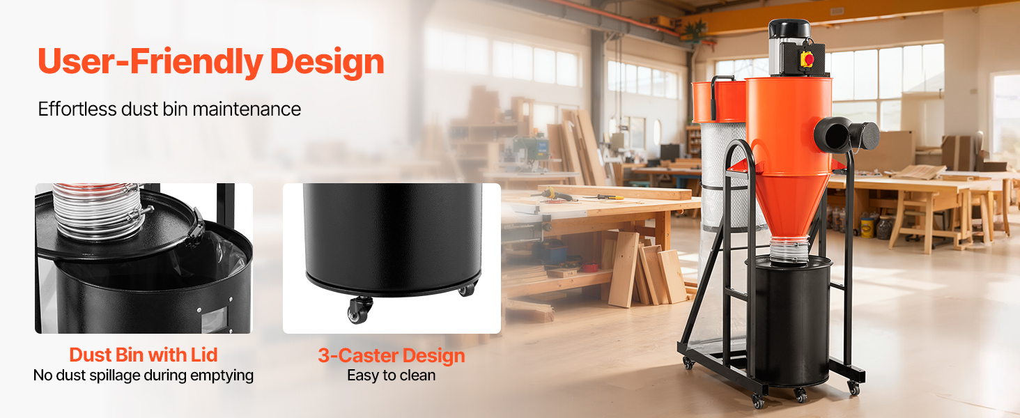 Tento cyklónový zberač prachu vybavený bezkefovým motorom s výkonom 1,5 HP, odsávaním 763 CFM a zásobníkom s objemom 12,5 galóna (47 l) zabezpečuje účinný zber prachu. Kompaktná konštrukcia na montáž na stenu a hladké spodné kolieska zjednodušujú nastavenie a manipuláciu, vďaka čomu je čistenie pri práci s drevom rýchlejšie a pohodlnejšie.