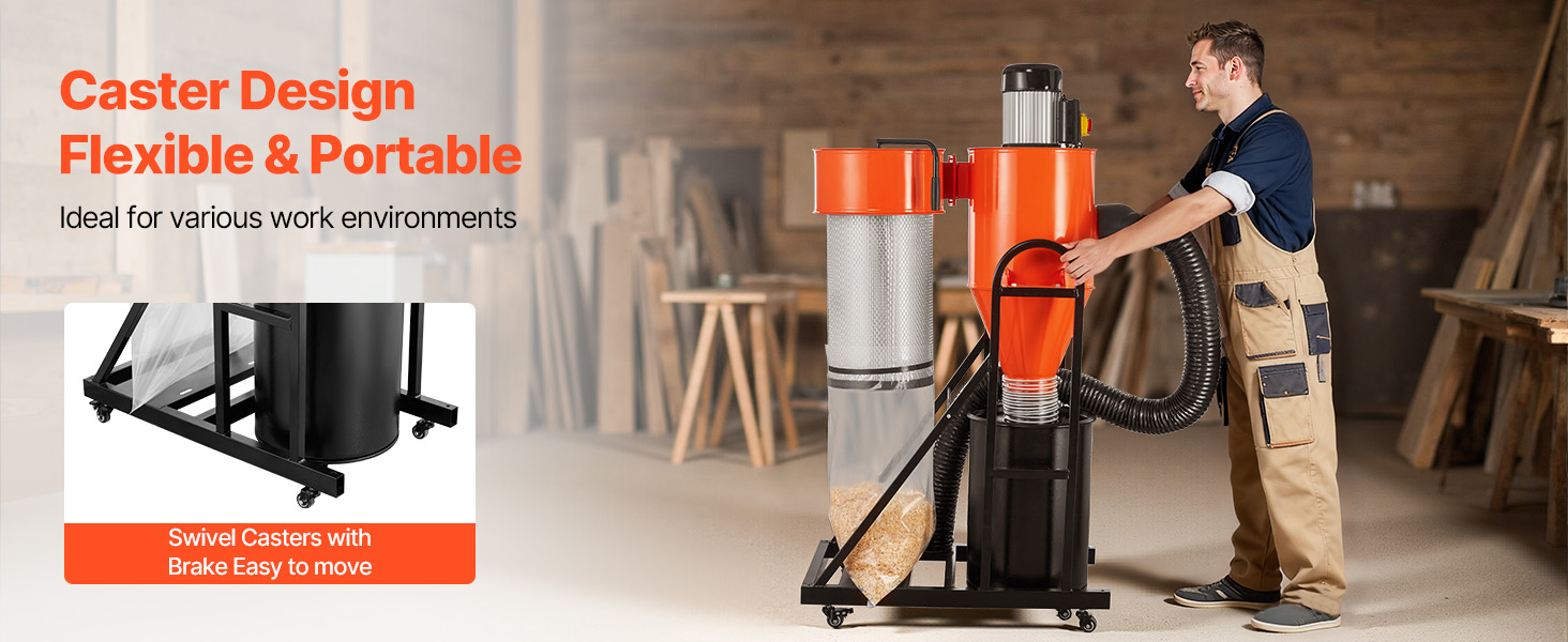 Vďaka otočným kolieskam umožňuje tento odlučovač prachu plynulý pohyb po rôznych pracovných priestoroch. Dá sa ľahko premiestňovať alebo nastavovať, čím poskytuje flexibilnú a efektívnu manipuláciu s prachom a zároveň zvyšuje pohodlie a celkovú produktivitu vo vašej dielni alebo továrni.