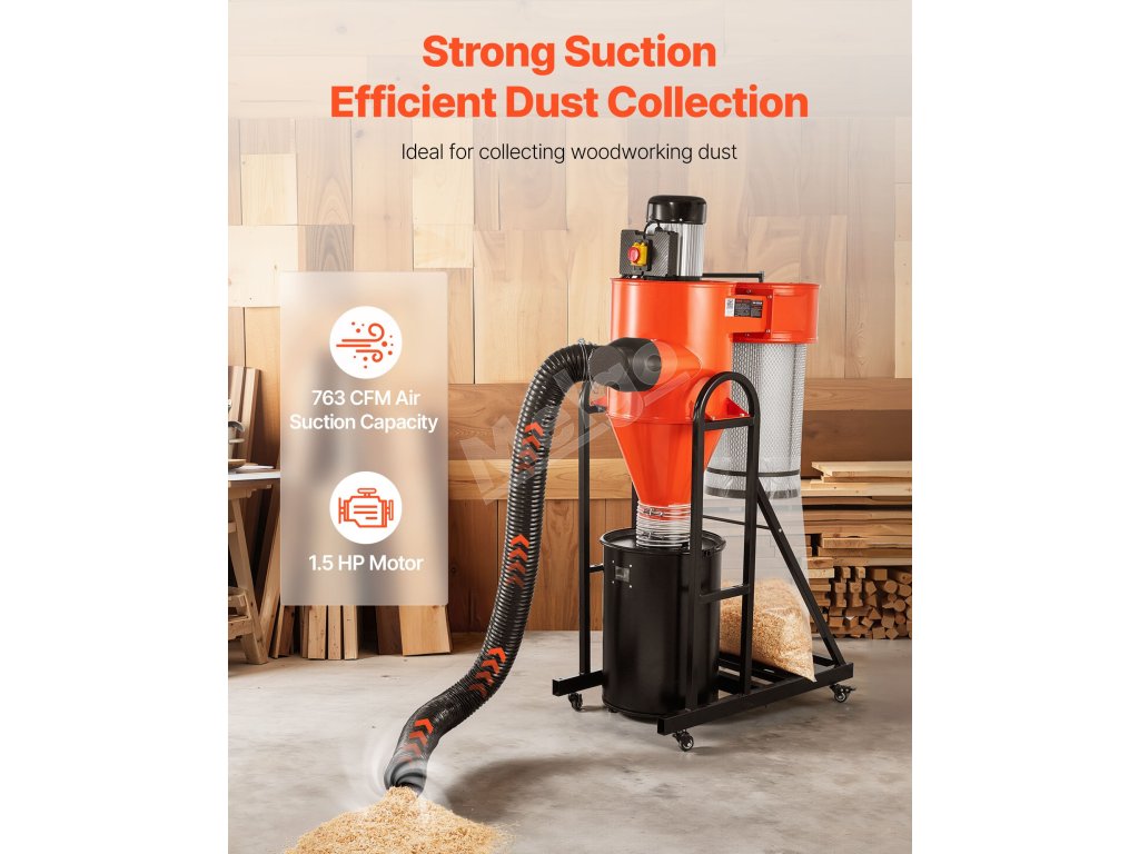 Tento cyklónový zberač prachu vybavený bezkefovým motorom s výkonom 1,5 HP, odsávaním 763 CFM a zásobníkom s objemom 12,5 galóna (47 l) zabezpečuje účinný zber prachu. Kompaktná konštrukcia na montáž na stenu a hladké spodné kolieska zjednodušujú nastavenie a manipuláciu, vďaka čomu je čistenie pri práci s drevom rýchlejšie a pohodlnejšie.
