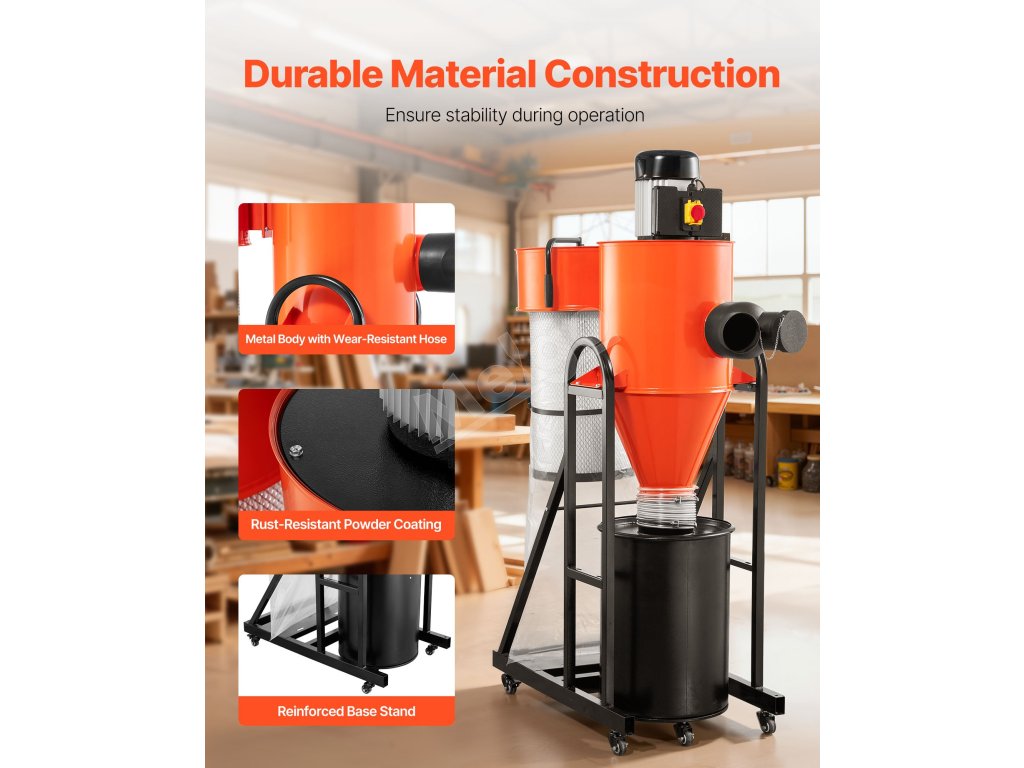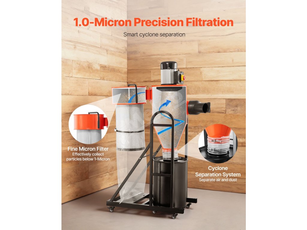 Tento cyklónový filtračný čistič, ktorý je ideálny pre drevárske, priemyselné a iné špecializované dielne, si poradí s dreveným prachom, kovovými hoblinami, mikročasticami a vzdušnými nečistotami. Ponúka vysokoúčinné zachytávanie prachu a kontrolu explózie, čím spĺňa náročné požiadavky od ťažkých až po presné prevádzky.