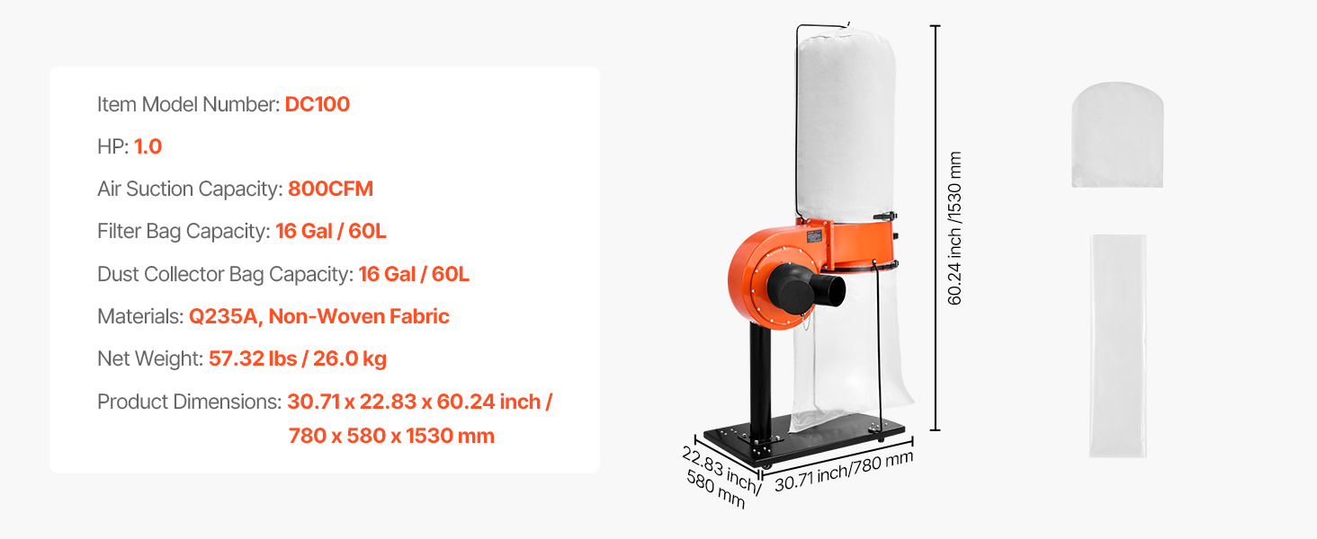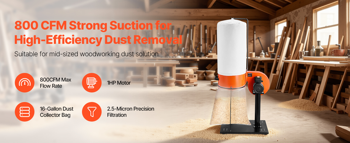 Tento 16galónový (60l) vysávač prachu vybavený odsávaním 800CFM, motorom s výkonom 1HP a 2,5mikrónovým filtrom kombinuje priestorovo úspornú nástennú konštrukciu so spodnými kolieskami a veľkým vreckom z netkanej textílie, čo umožňuje rýchly a účinný zber prachu a ľahký pohyb v dielni.