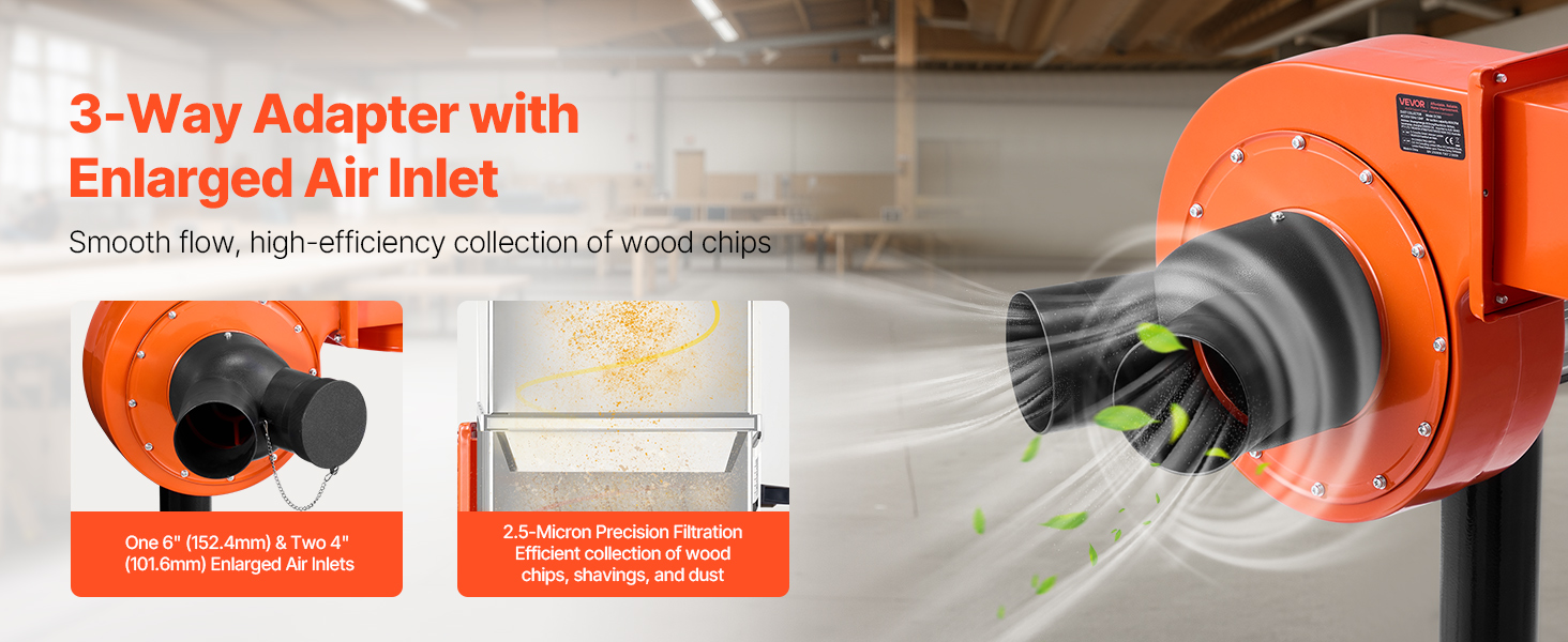 Tento zberač prachu na obrábanie dreva je vybavený 6″ / 152,4 mm a dvoma 4″ / 101,6 mm zväčšenými otvormi na nasávanie vzduchu na účinnejšie odsávanie prachu a jemných častíc. Zvýšený prietok vzduchu zvyšuje čistiaci výkon a zároveň znižuje upchávanie, vďaka čomu bude vaša dielňa čistejšia a údržba jednoduchšia.