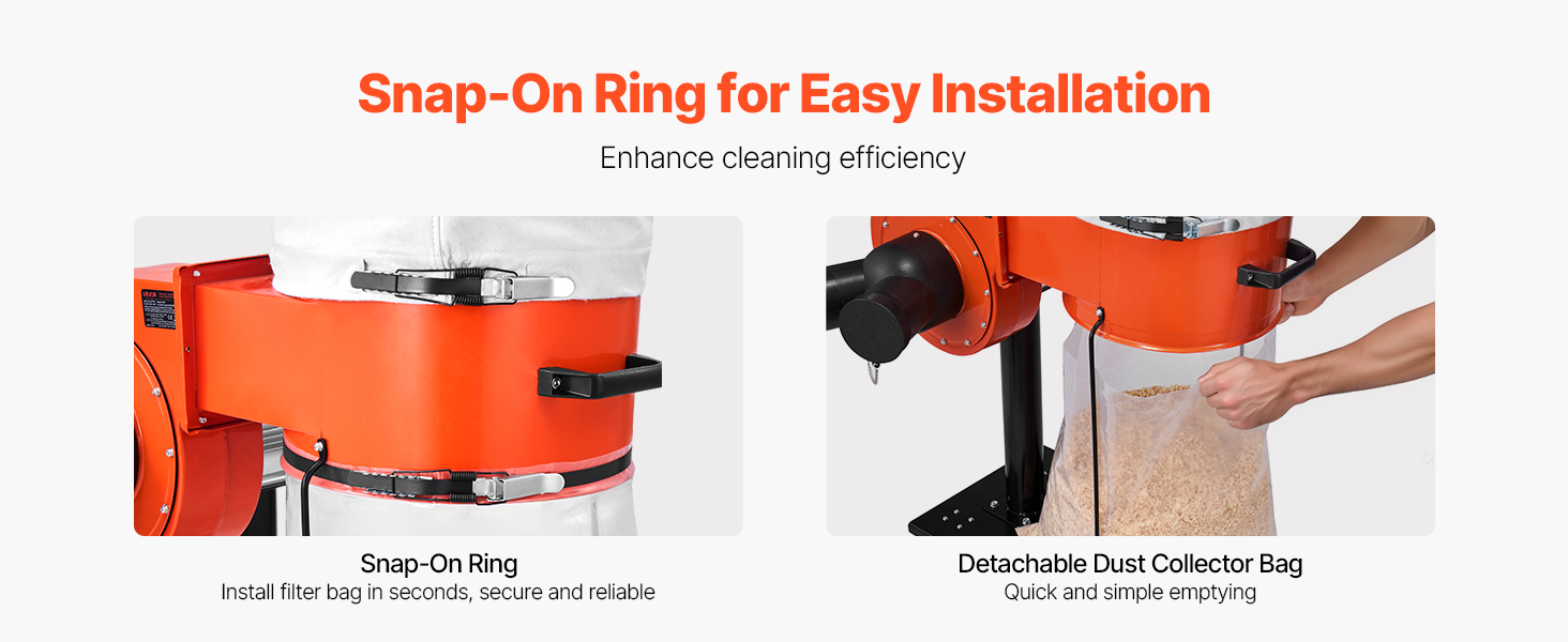 Tento systém zberu prachu je vybavený pripínacími filtrami a zbernými vreckami na rýchlu inštaláciu a bezpečné upevnenie. Keď je čas na čistenie, vrecko sa dá jednoducho vybrať, čím sa rýchlo uvoľní prach a vaša dielňa bude čistá, efektívna a časovo nenáročná.