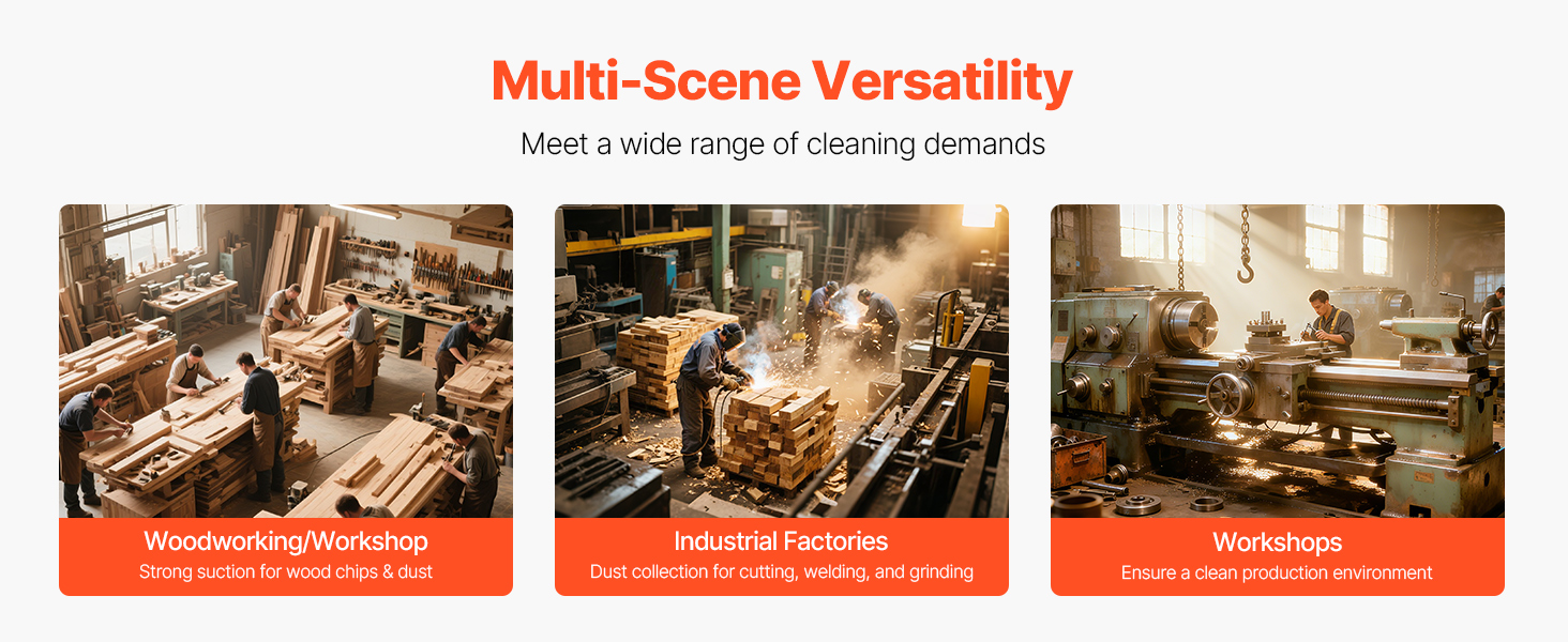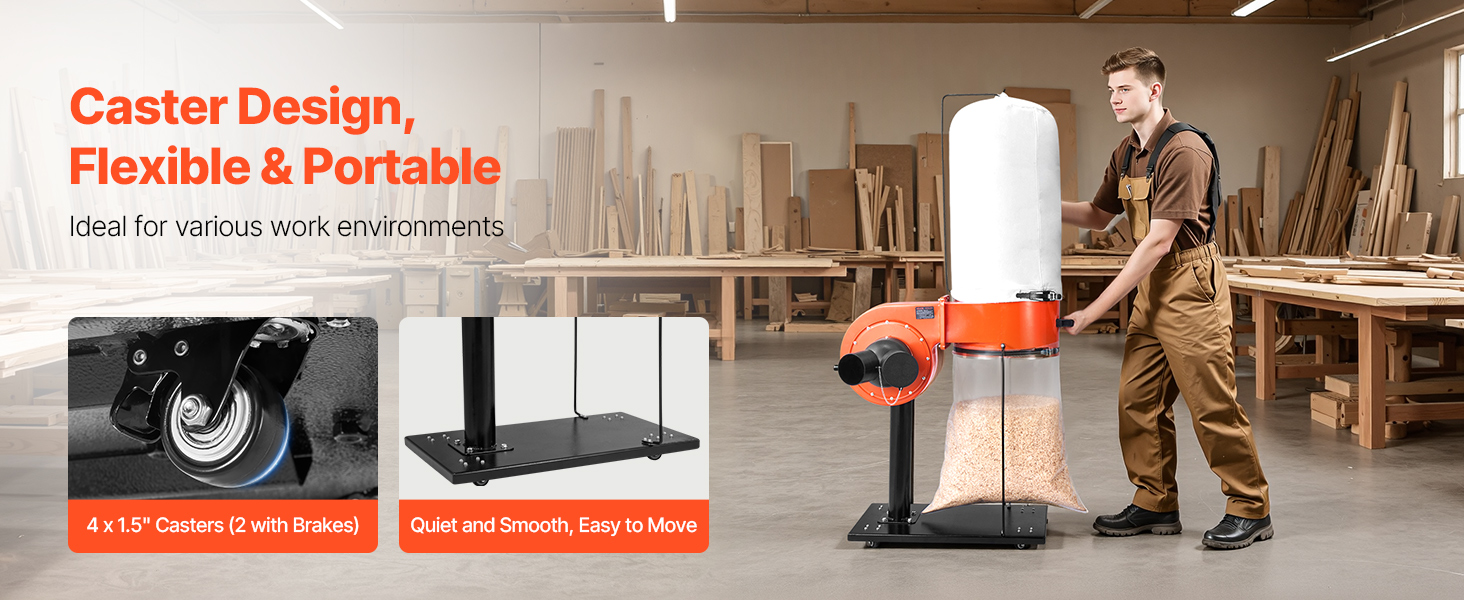 Tento zberač prachu VEVOR na spracovanie dreva je vybavený štyrmi flexibilnými kolieskami na bezproblémový pohyb po dielni. Ľahko ho preveziete na ľubovoľné miesto a hladko sa bude kĺzať, čím vytvoríte efektívnejší, pohodlnejší a prispôsobivejší zber prachu pri rôznych aplikáciách.