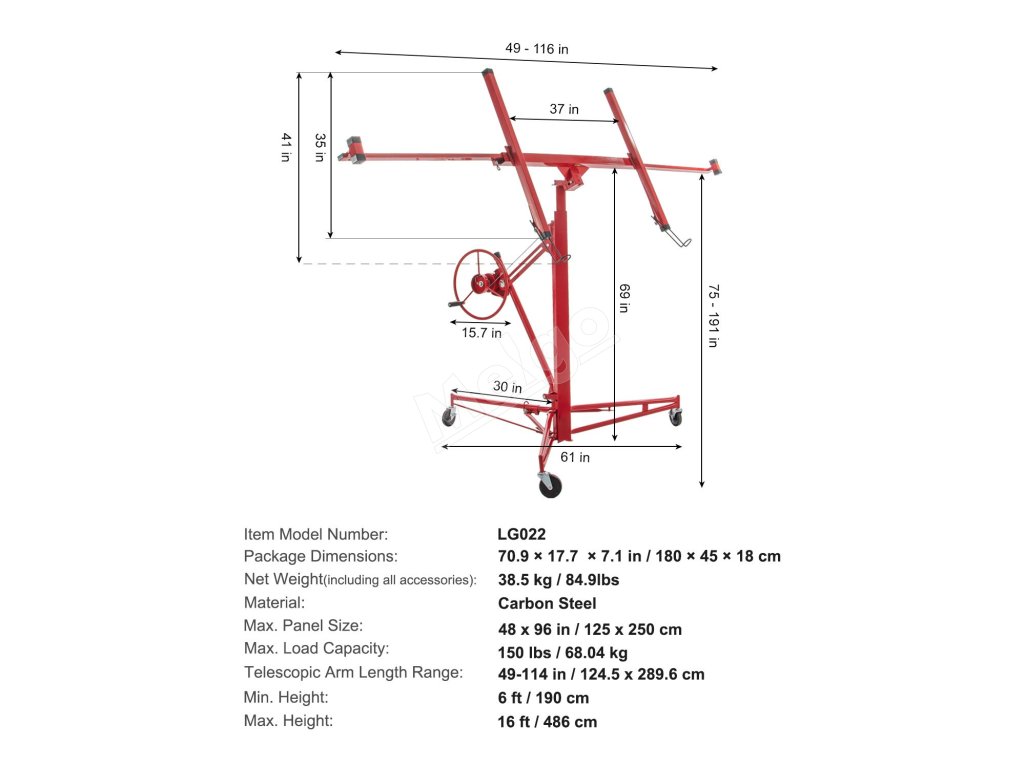 Zdvíhač sadrokartónu 16ft 150lb oceľ teleskop. rameno 3 kolieska