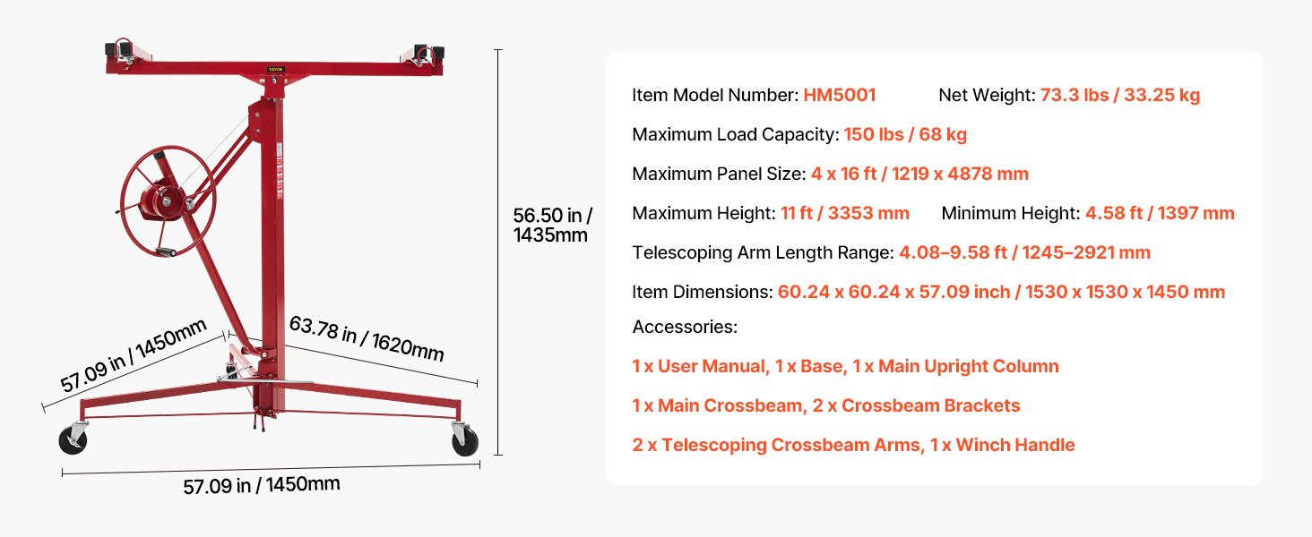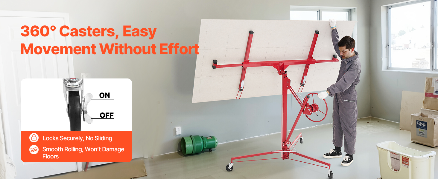 Montáž alebo demontáž v priebehu niekoľkých sekúnd bez použitia náradia. Unesie až 150 libier. Vybavený kolieskami a brzdami pre vynikajúcu stabilitu a plynulú mobilitu, vďaka čomu je ideálny na jednoduchú inštaláciu sadrokartónu na strop a stenu.