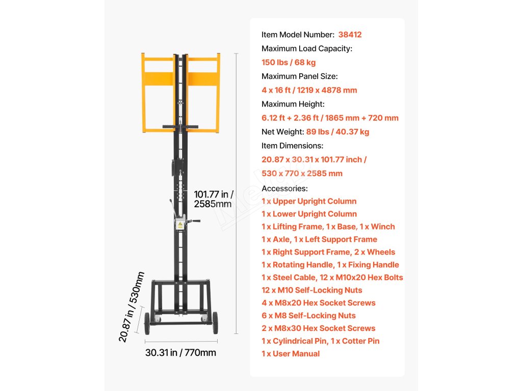 Zdvihák na sadrokartón 68 kg, max panel 1219×4878 mm, s kolieskami